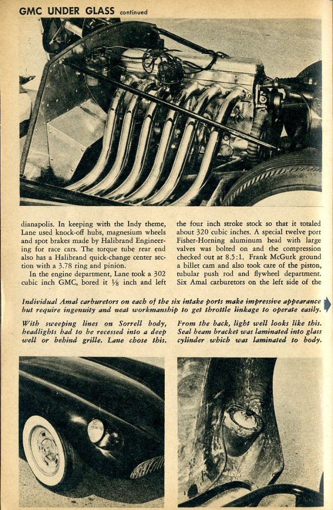 In the engine department, Lane took a 302 cubic inch GMC, bored it 1/8 inch and left the four inch stroke stoke so that it totaled about 320 cubic inches. A special twelve port Fisher-Horning aluminum head with large valves was bolted on and the compression checked out at 8.5:1.