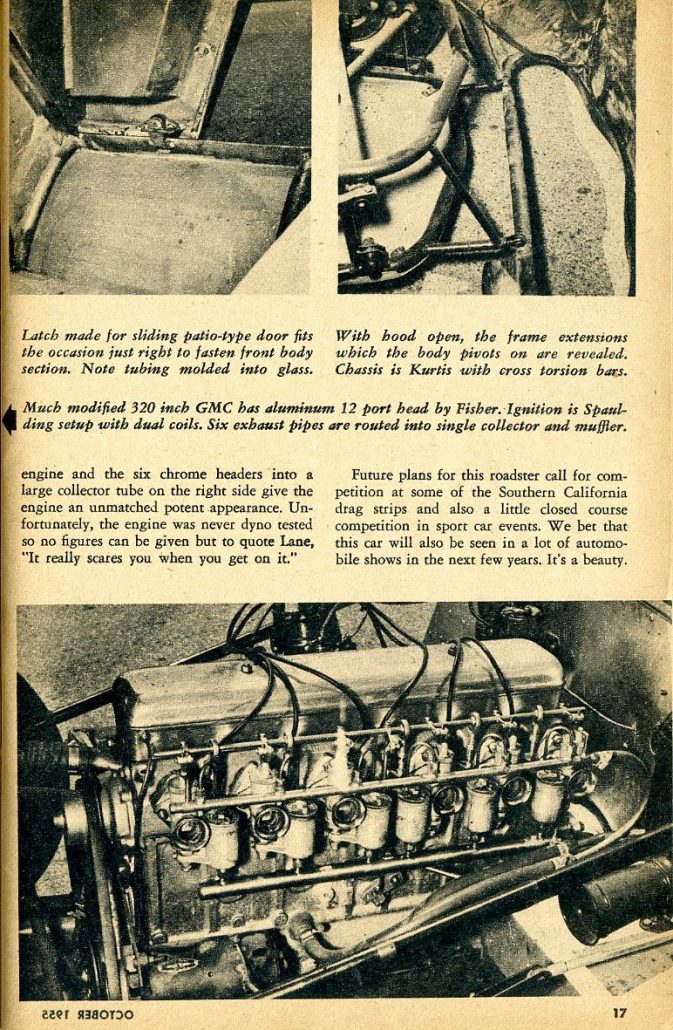 Unfortunately, the engine was never dyno tested so no figures can be given but to quote Lane, “It really scares you when you get on it.” Future plans for this roadster call for competition at some of the Southern California drag strips and also a little closed course competition in sport car events.