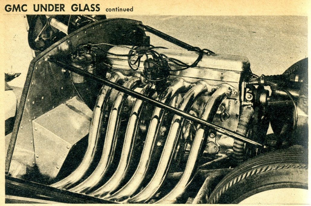- Caption: Much modified 320 inch GMC has aluminum 12 port head by Fisher. Ignition is Spaulding setup with dual coils. Six exhaust pipes are routed into single collector and muffler.
