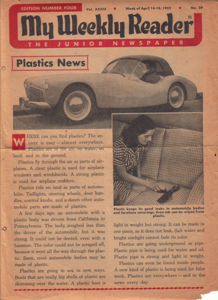 So…. it shouldn’t come as a big surprise that this same general excitement and discussion would trickle down to high schools, middle schools, and grade schools in the early 1950’s as the “miracles” of fiberglass became better known. And indeed….. this is exactly what happened when the perennial “Weekly Reader” covered “Plastic News” and the introduction of the first fiberglass bodied sports car – the “Glasspar G2” to their 8-12 year old readership in 1952.