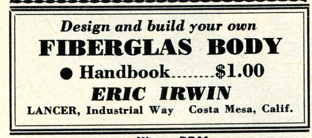 It’s always been amazing to me that Eric Irwin’s name has mostly been lost to history. I hope that thru the research Rick D’Louhy and I complete and share that we can change that understanding and bring to Eric recognition for his early contributions to the history of fiberglass sports car building.