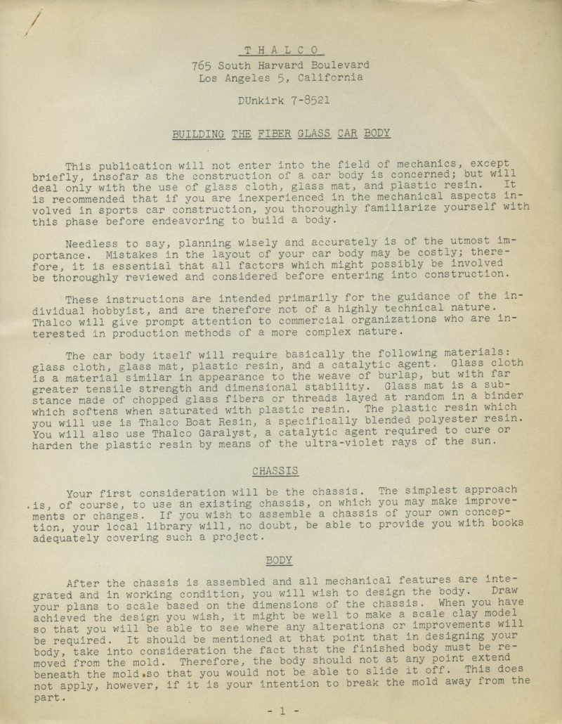 Let me know if any of you out there would like to see the full version of this book on our website. There are actually 2 versions of Eric Irwin’s book – one about 14 pages long and another about 20 pages long. There are not a lot of pictures in either edition of these books, but Eric tells you everything you need to know – as of 1952 – about how to design and build a fiberglass car body – and he emphasizes how hard it is too!