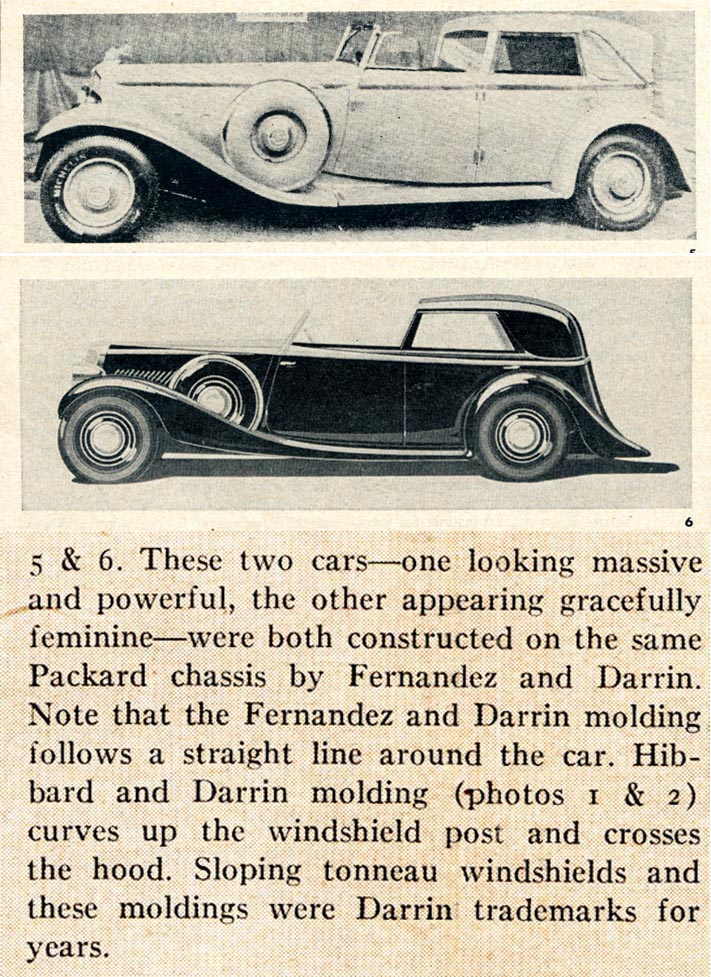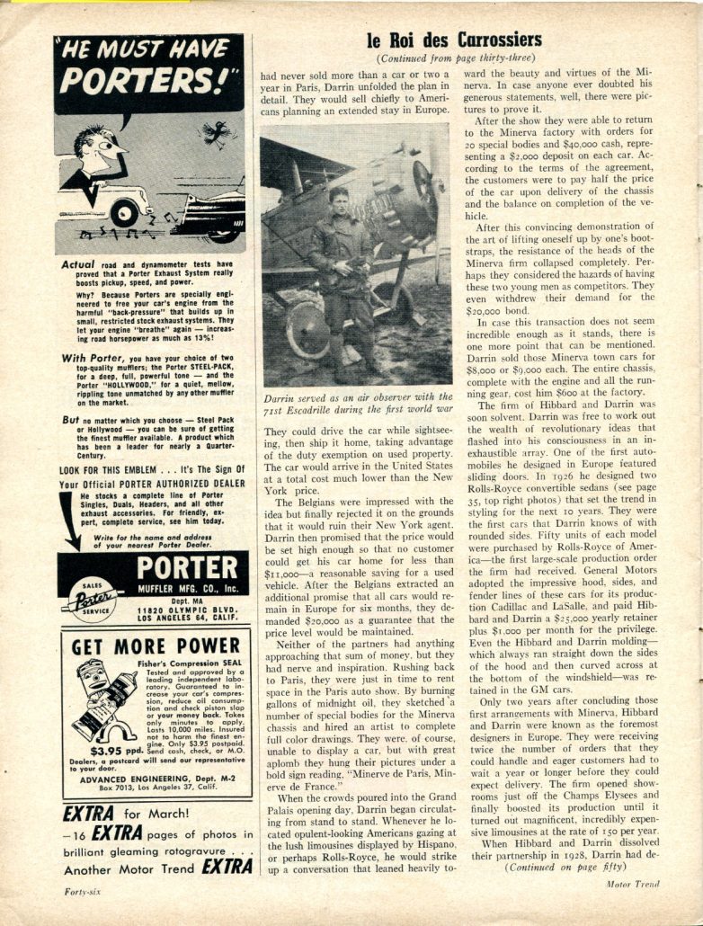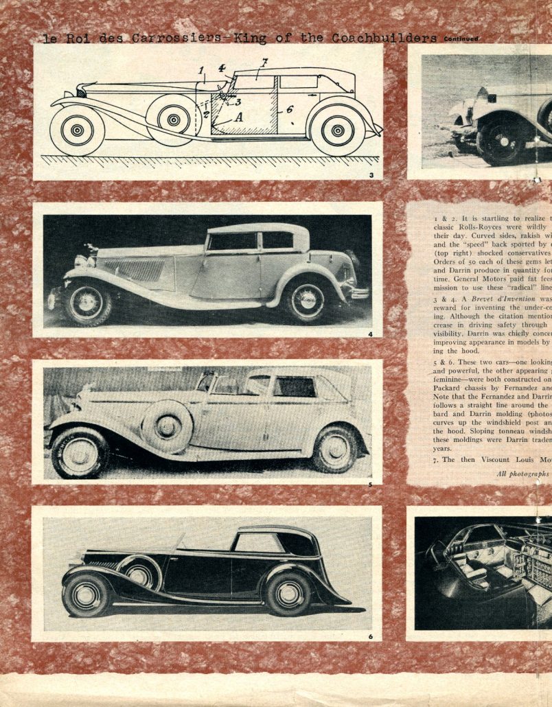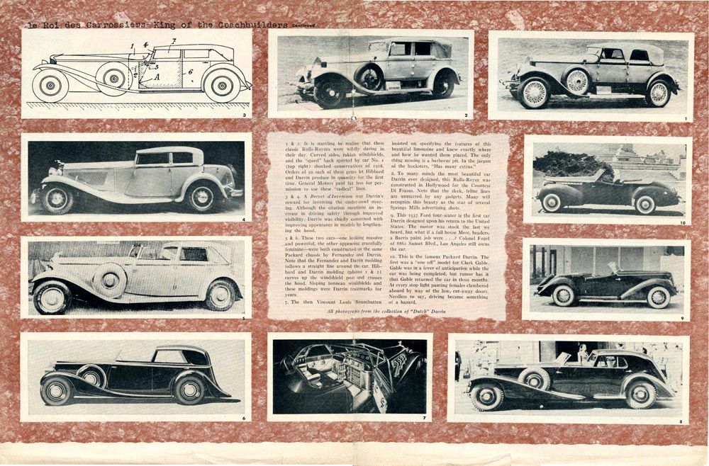 Darrin has a natural instinct for showmanship; he is a born promoter.  And both his ideas on designs and the cars he has constructed are as bold and original in their concept as are his schemes to attain financial backing.  That is why he has reigned as king of the coachbuilders for 30 years.  Darrin the artist and Darrin the business man worked as a smooth team when he first started in Paris.  He and Tom Hibbard had gone to Paris in 1922 as representatives of the budding LaBaron Company, but they soon realized that the wealthy tourists from all over the world, represented a gold mine to enterprising coachbuilders.