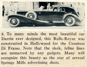 Hollywood could not resist the lure of a French designer; and somehow the rumor never did insist on the fact that the fabulous Howard A. Darrin of European renown is as American as Coney Island.  Darrin chuckles as he remembers those days.  “With a name like Darrin, and that sign ‘Darrin of Paris,’ everyone automatically assumed that I was French.  In Hollywood that was worth more than all the work I had ever done.