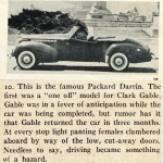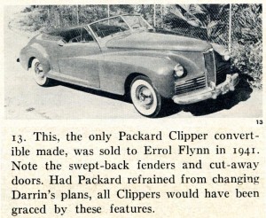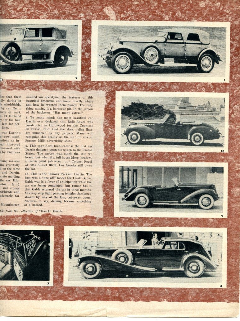 Strangely enough, this car was one of the last “one off” cars that Darrin constructed.  The shop on the Sunset Strip had started well.  Rudy Stoessel and Burt Chalmers (who are now partners in Coachcraft Ltd. of Hollywood) were in charge of construction and sales and the shop was well organized.  Darrin was turning out incomparable cars; but from the standpoint of the classic car fan, things went to pot when the first Packard Darrin was delivered to Clark Gable.