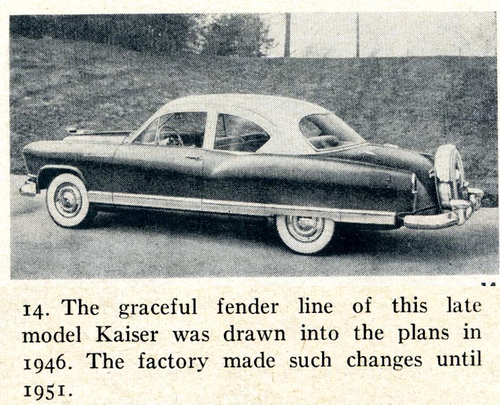 The latest cars he designed in Europe show amazing flexibility in concept.  Some of his cars achieve their effect through a feeling of massive power (see the Panhard photo on page 34, lower left) while others attain beauty through graceful, flowing curves (see center lower photo, page 34).