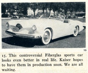 Although Darrin’s contract with Kaiser forbids him to do any free-lance designing, he is far from inactive.  He is at present furiously engaged in the preparation of five new Fiberglas sports cars for delivery to the Kaiser factory.  If everything goes well, these cars should be in factory production within a year and will be sold at around $2,800.