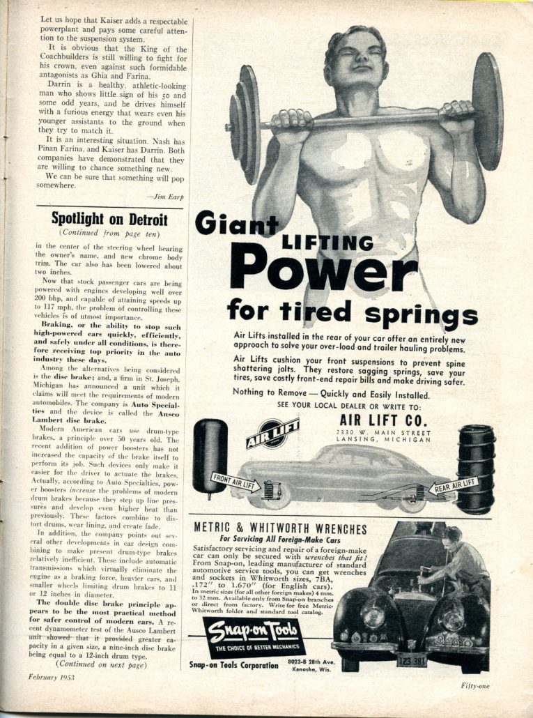 Darrin is a healthy, athletic-looking man who shows little sign of his 50 and some odd years, and he drives himself with a furious energy that wears even his younger assistants to the ground when they try to match it.  It is an interesting situation, Nash has Pinan Farina, and Kaiser has Darrin.  Both companies have demonstrated that they are willing to chance something new.