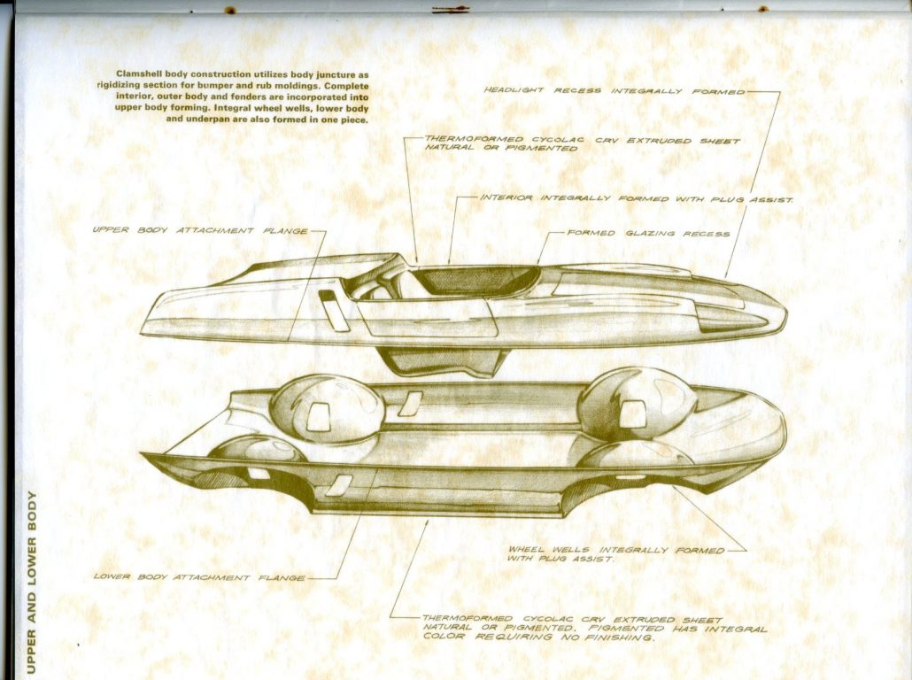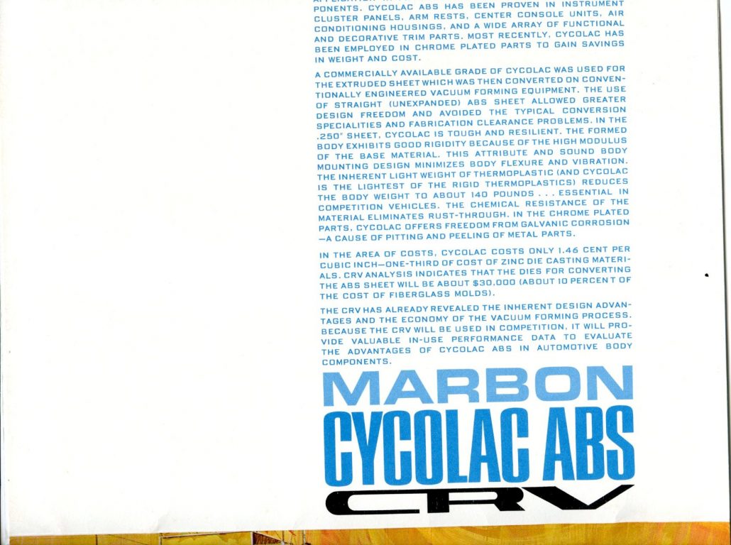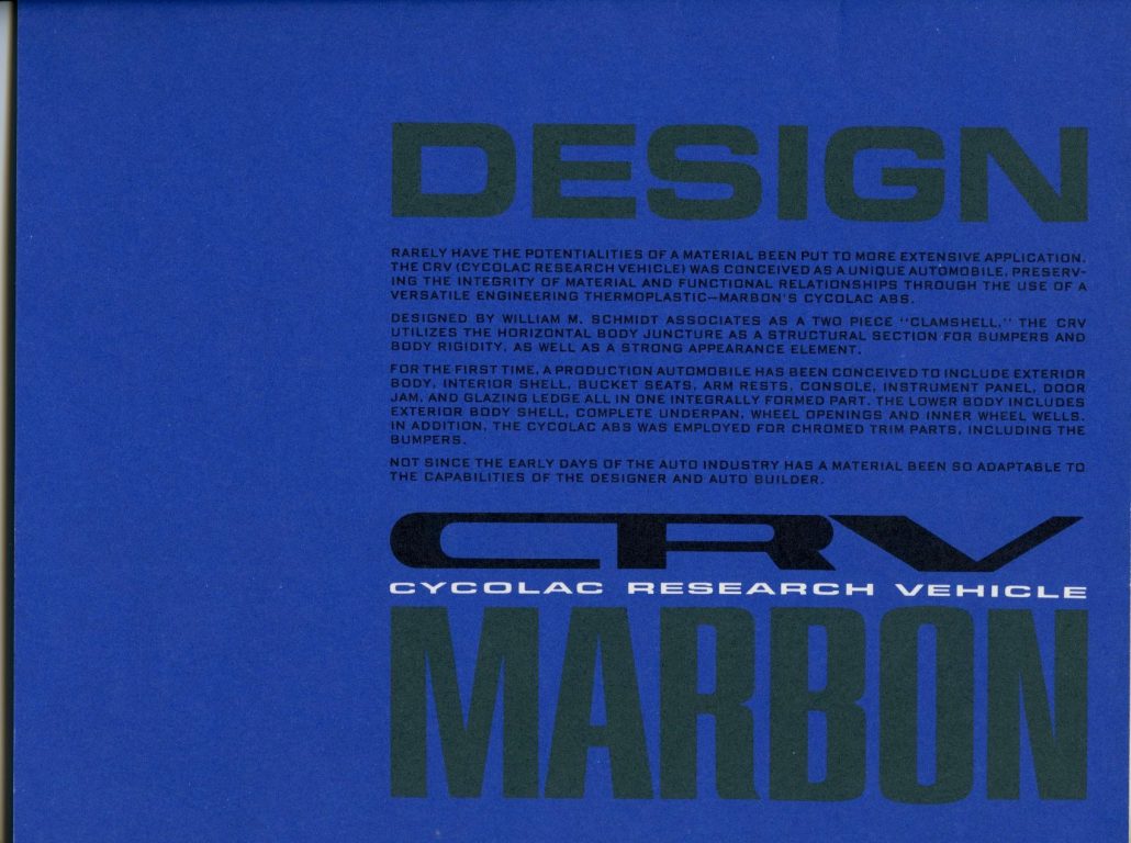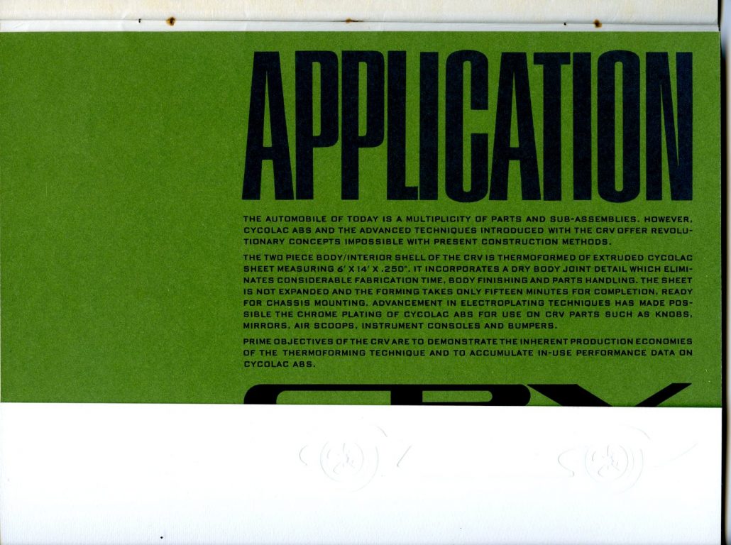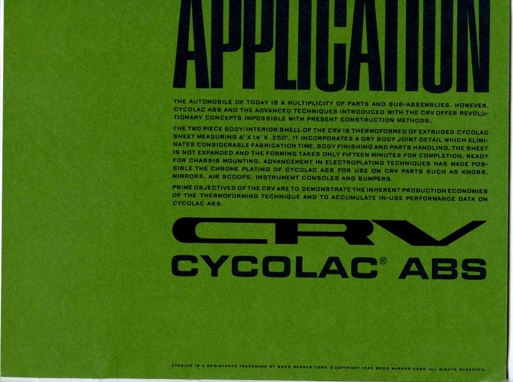 “Rarely have potentialities of a material been put to more extensive application. The CRV (Cycolac Research Vehicle) was conceived as a unique automobile, preserving the integrity of material and functional relationships through the use of a versatile engineering thermoplastic – Marbon’s Cycolac ABS.