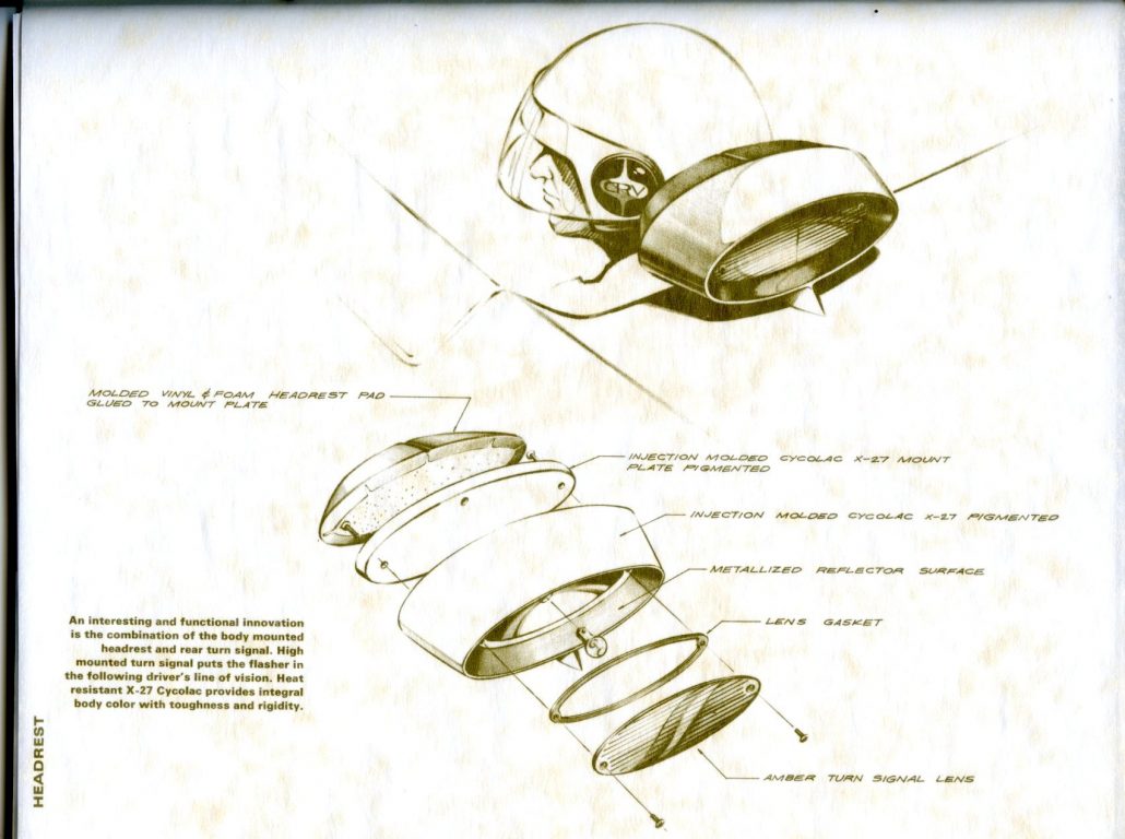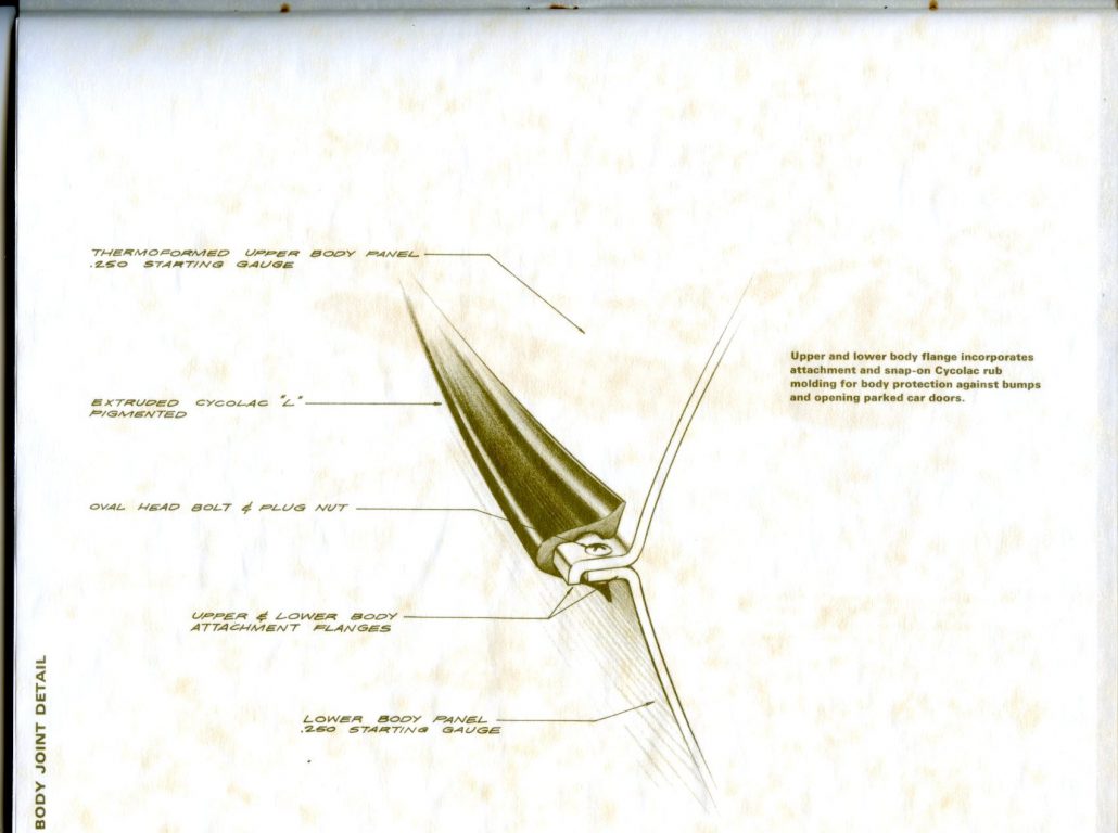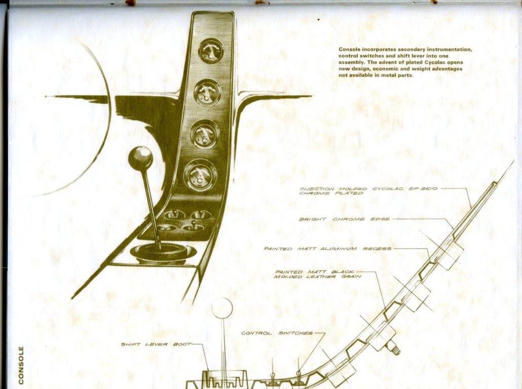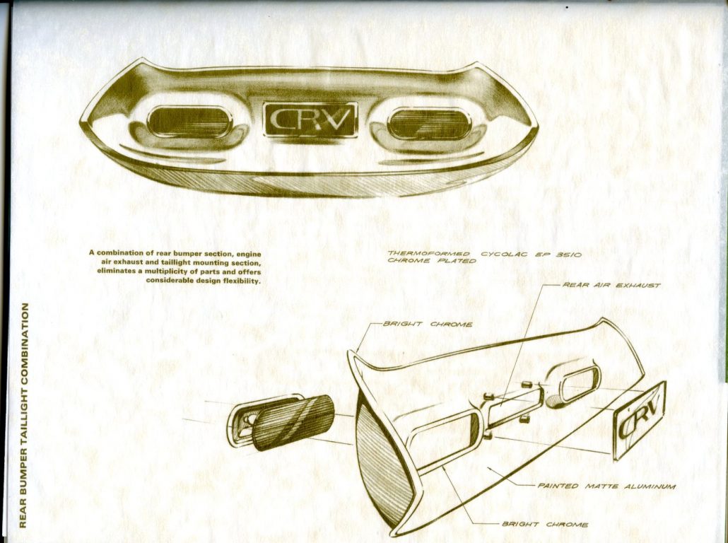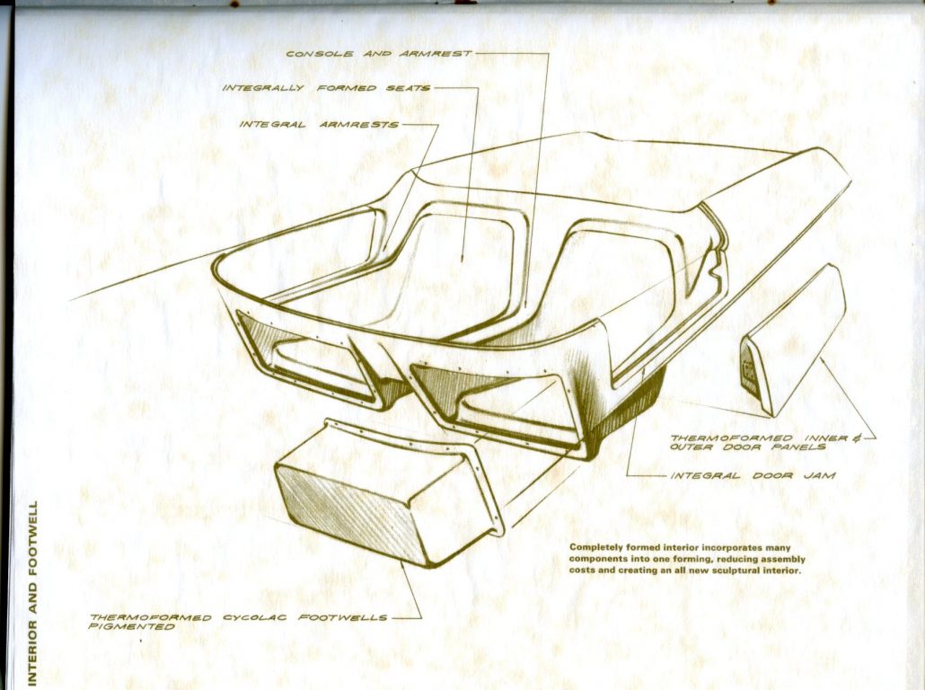 “Rarely have potentialities of a material been put to more extensive application. The CRV (Cycolac Research Vehicle) was conceived as a unique automobile, preserving the integrity of material and functional relationships through the use of a versatile engineering thermoplastic – Marbon’s Cycolac ABS.