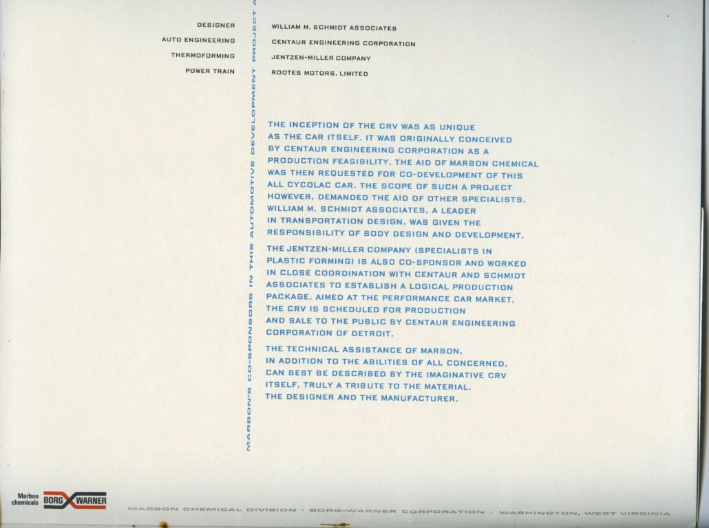 Appreciation is also extended to Raffi Minasian who first made this brochure available for scanning and later archival purposes here at Forgotten Fiberglass. Thanks Raffi! And for those of you who wish to learn more about this very special “plastic” and later “fiberglass” sports car, click here to visit Nick Whitlow’s, CRV historian’s website – the best source available for a full history on these cars.