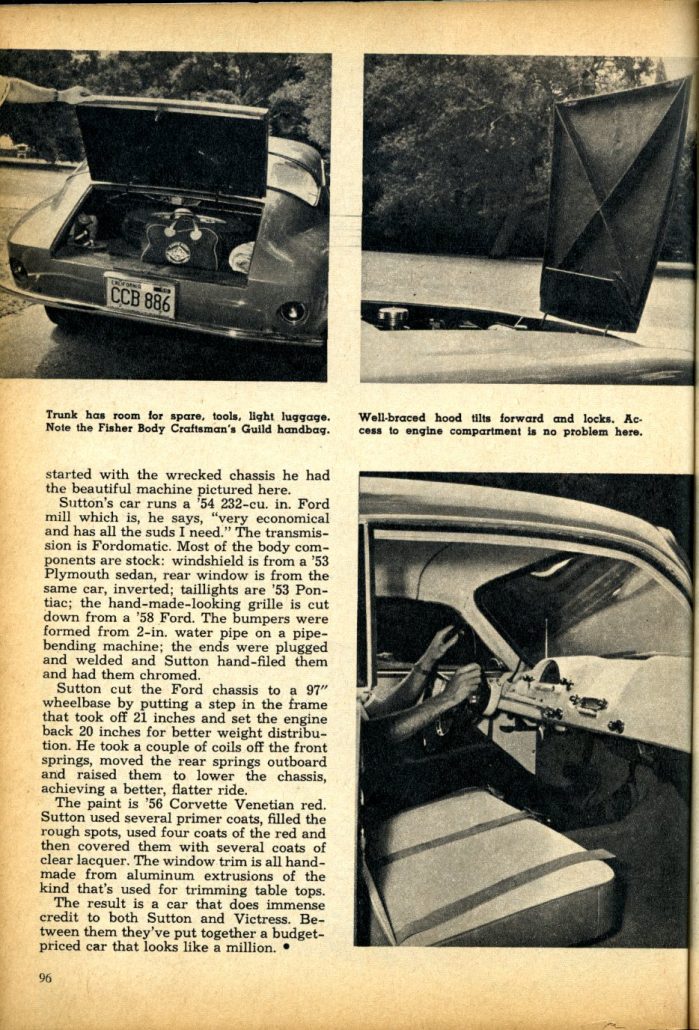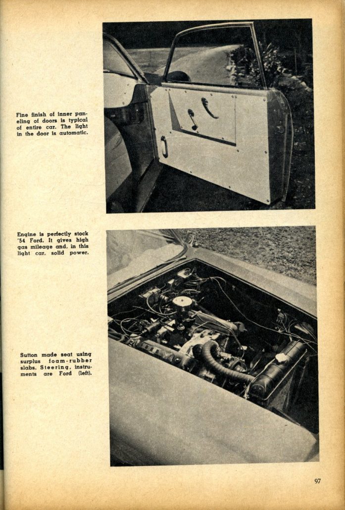 Seven months and $1500 after he’d started with the wrecked chassis he had the beautiful machine pictured here. Sutton’s car runs a ’54 232 cubic inch Ford mill which is, he says, “very economical and has all the suds I need.” The transmission is Fordomatic.