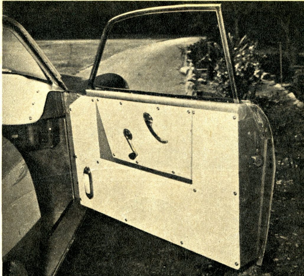 The low-cost body he designed for Victress eliminates as many special components as possible. Headlights, grille, windshield, rear window, etc., are all stock out of various automobiles. For this inexpensive body, Victress sends buyers a set of templates on how to make the doors worked out for ’50 Ford components in the hinges and latches. All this, of course, is in the interest of economy.