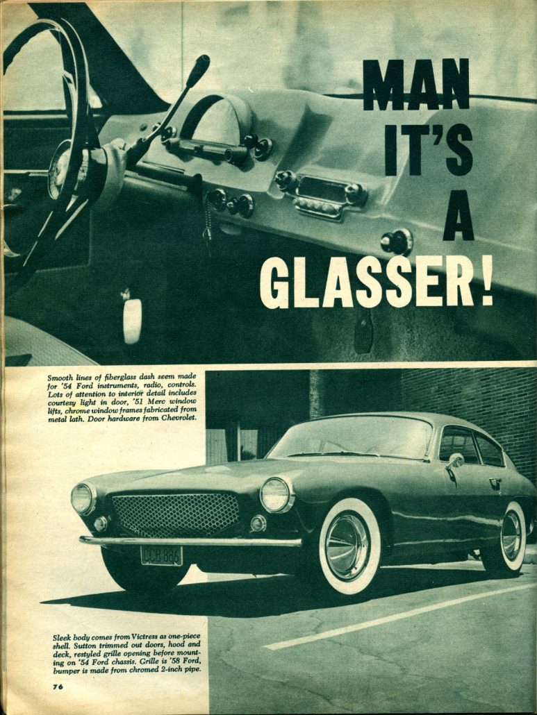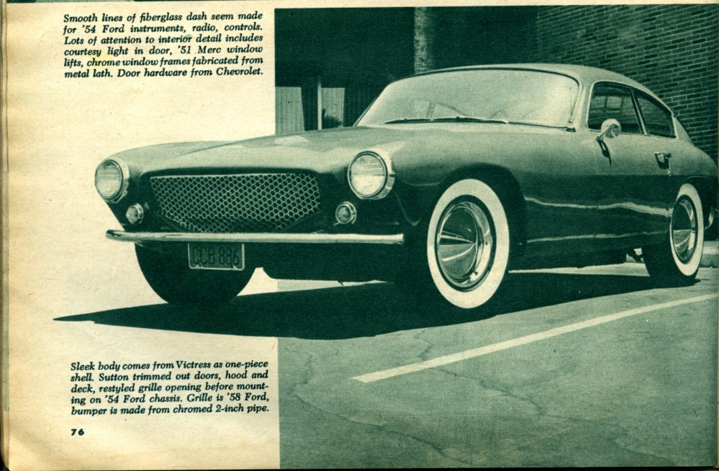 “Sleek body comes from Victress as one-piece shell. Sutton trimmed out doors, hood, and deck, restyled grille opening before mounting on ’54 Ford chassis. Grill is ’58 Ford, bumper is made from chromed 2-inch pipe.”