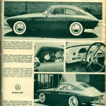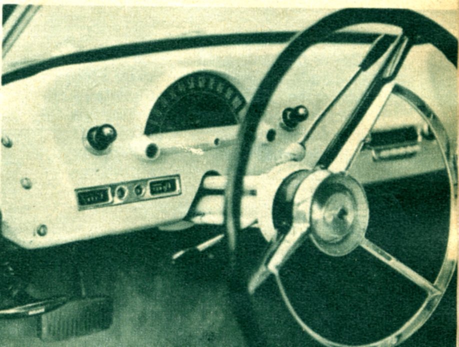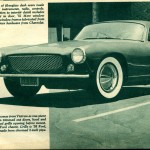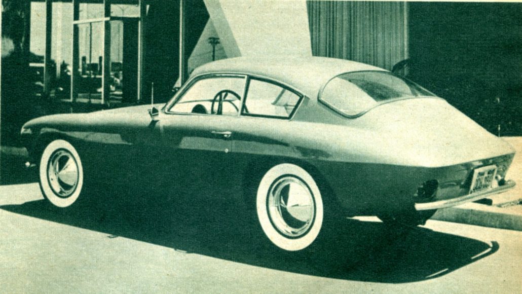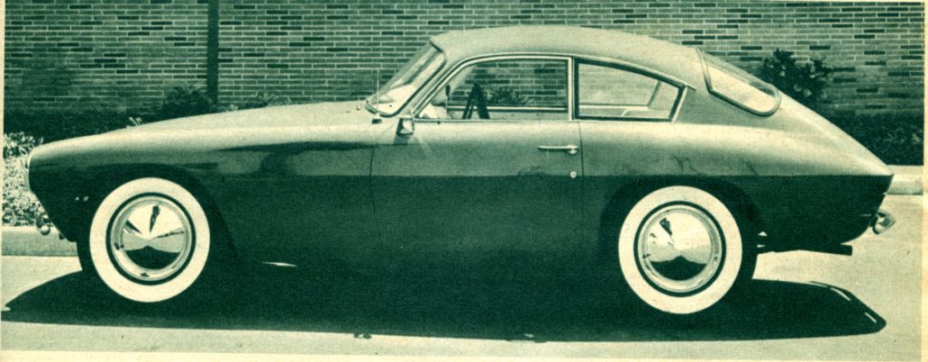 “Looks great from any angle. Low, sculptured belt line and inset tail lights add to speeding-while-parked illusion. Trunk lid, nearly invisible, opens into tiny compartment that holds spare tire, fuel tank filler, radio speaker, and very little luggage.”