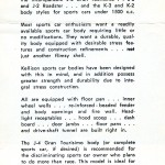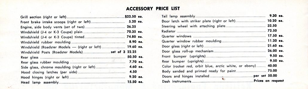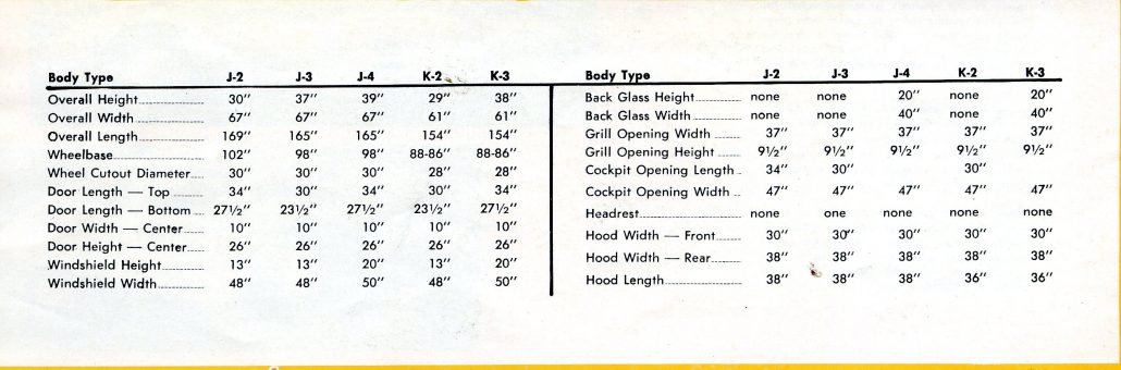 And what about the “J” and the “K” designations? No doubt they came from the first letters of “Jim Kellison’s” first and last name. How were they used? In today’s brochure the “K” designation is used for both the roadster and coupe models. Size may matter here….both of the “K” cars in the brochure below are for 86-88 inch wheelbase cars. All “J” cars have a 98 inch wheelbase or larger.