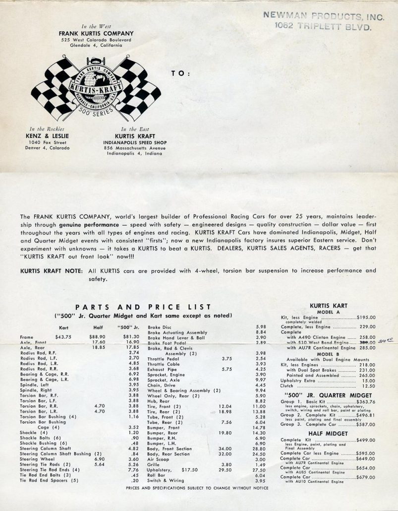 This sales flyer is interesting in that it captures the moment when “carting” was moving from traditional bodied midget racing cars to the newer carts without bodies – streamlined in the sense of all extra weight being removed.  Pricing is also shown for all 3 model cars and varies from a low price of $195 for a basic “Kurtis Kart” to a near $700 price of a fully optioned “Half Midget.”  Let’s have a look at the flyer:
