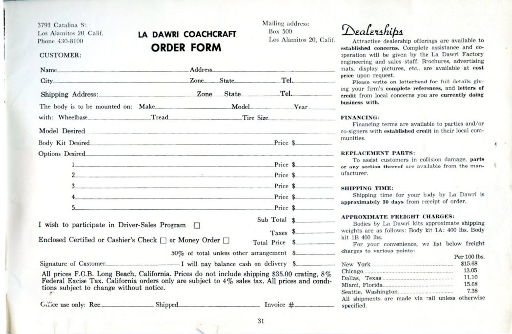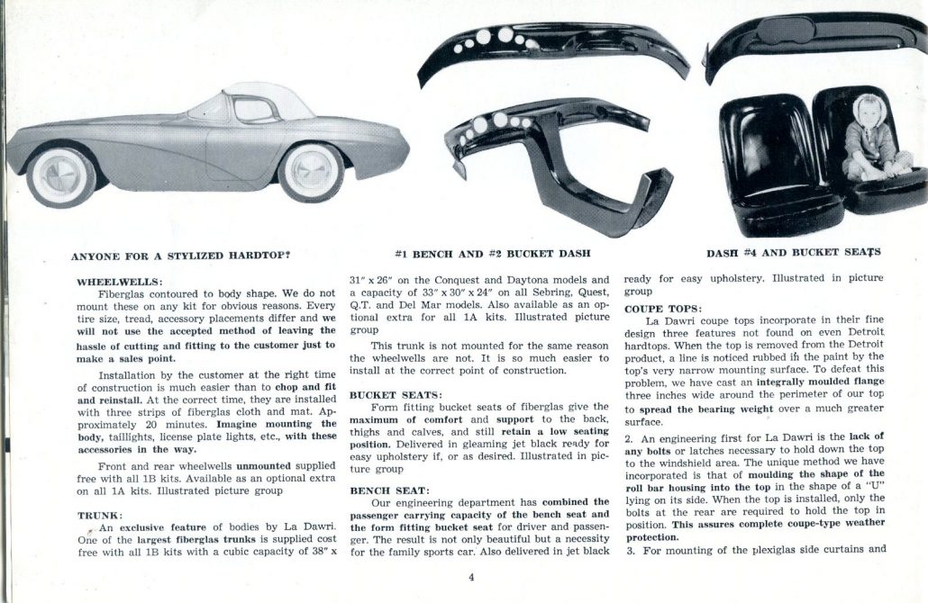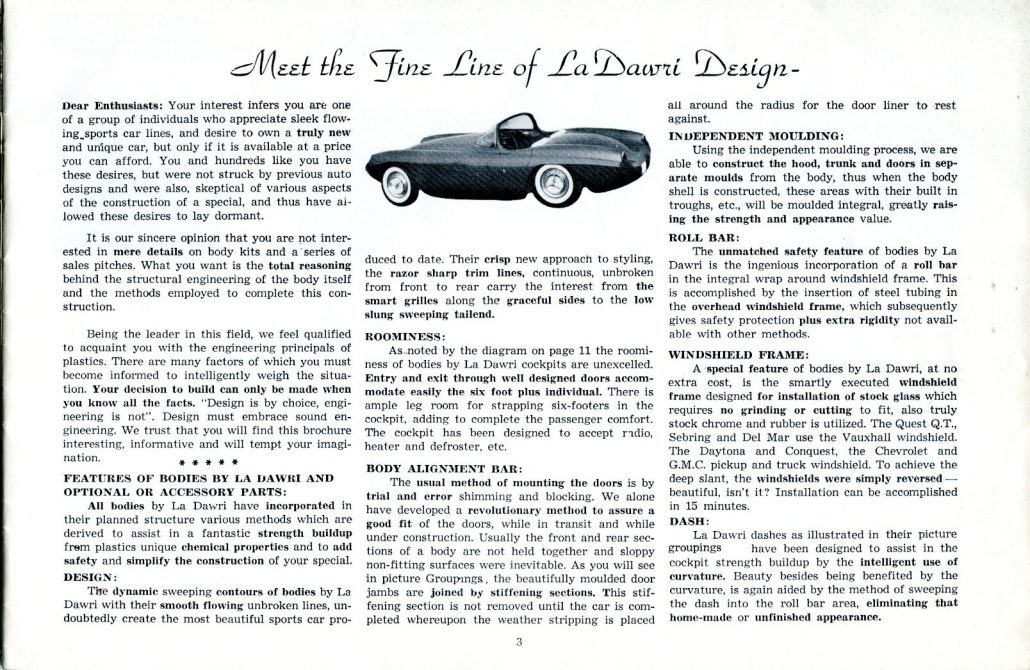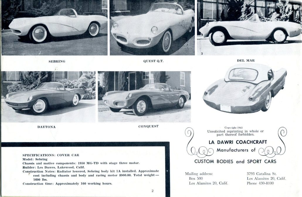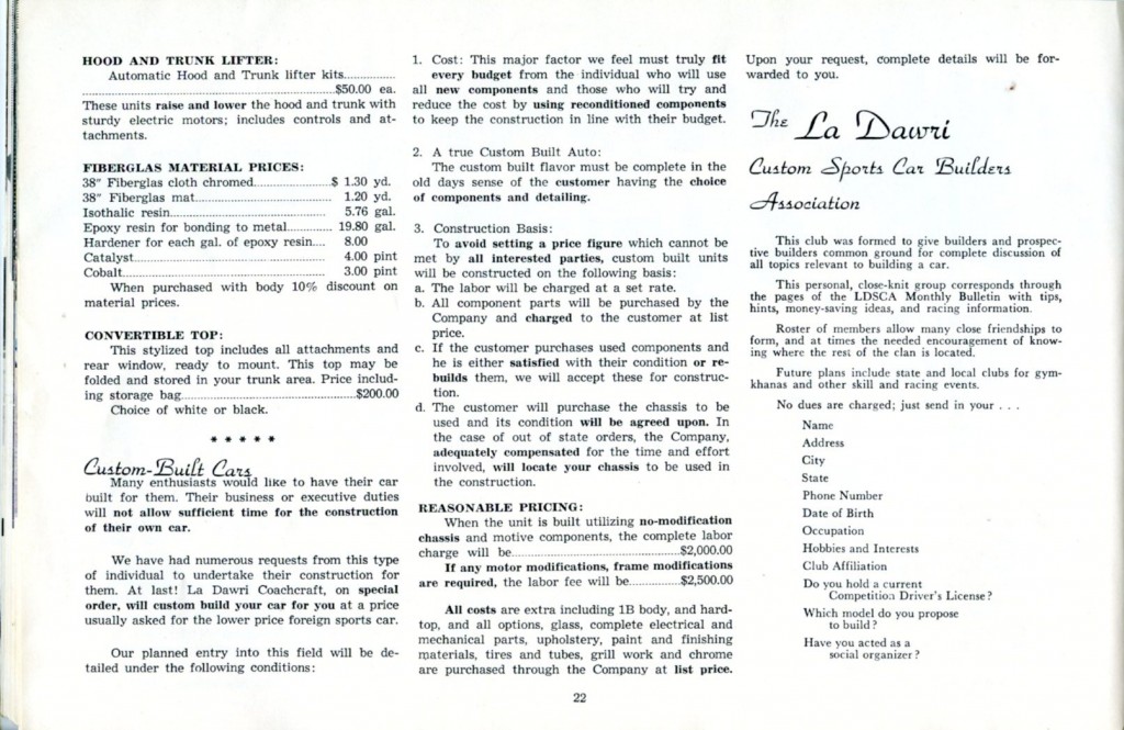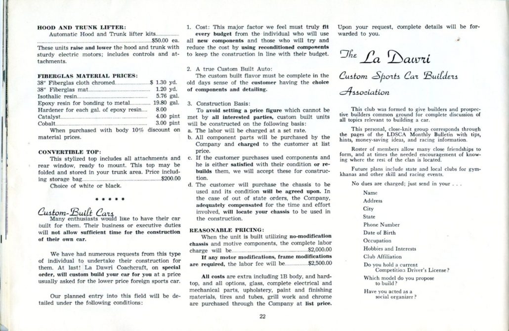 Did you know Les Dawes started a club called “The La Dawri Custom Sports Car Builders Association?” It’s shown on page 22 of the catalog above, and is just one of many fascinating tidbits of information that await each of you as you delve into the pages – and history – of La Dawri Coachcraft and their 1963 Catalog.