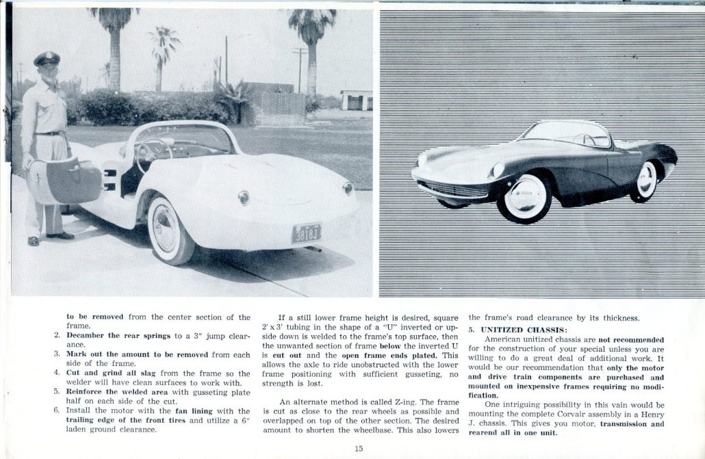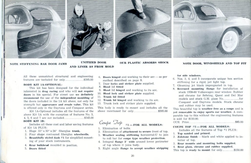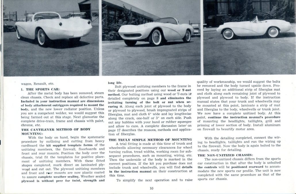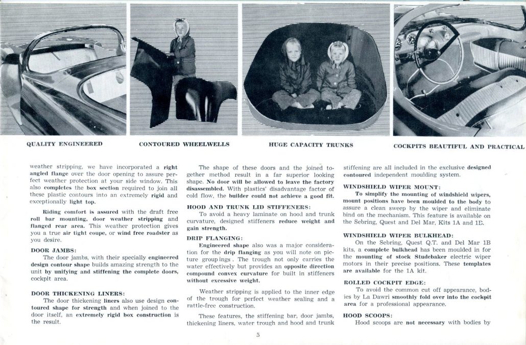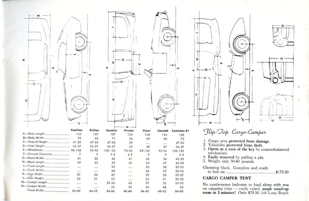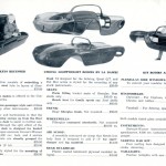 Eight distinctly different designs all offered in fiberglass – with some offered in different sizes (different names in the above list denote different sized cars too). Pretty impressive job for a young couple and young company to produce. By 1963, their company was 7 years old and still expanding. Let’s see what their ’63 catalog had to offer their customers of this era: