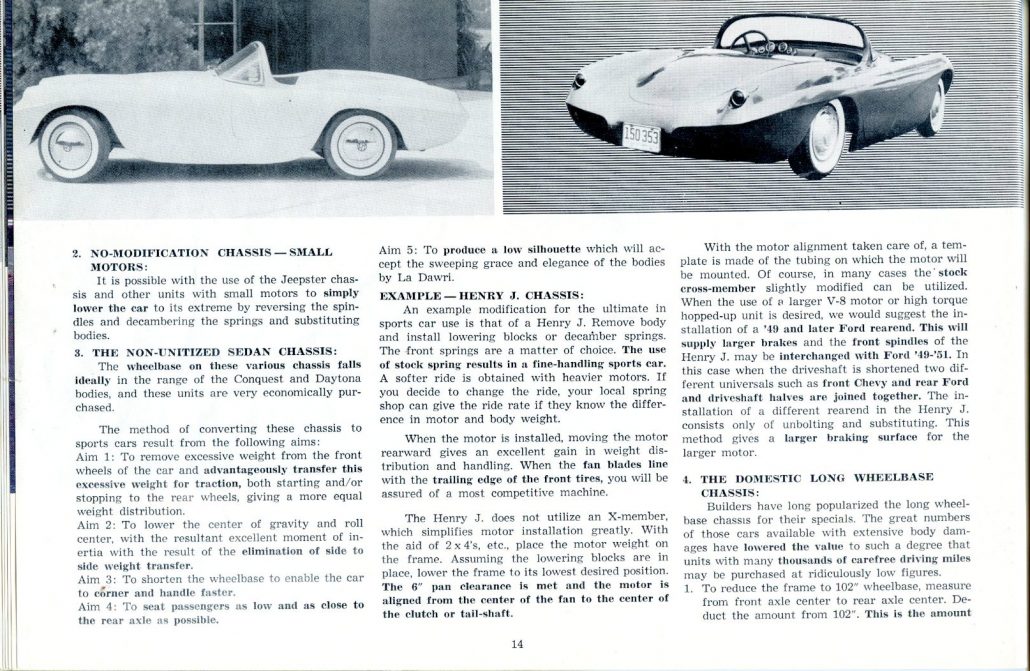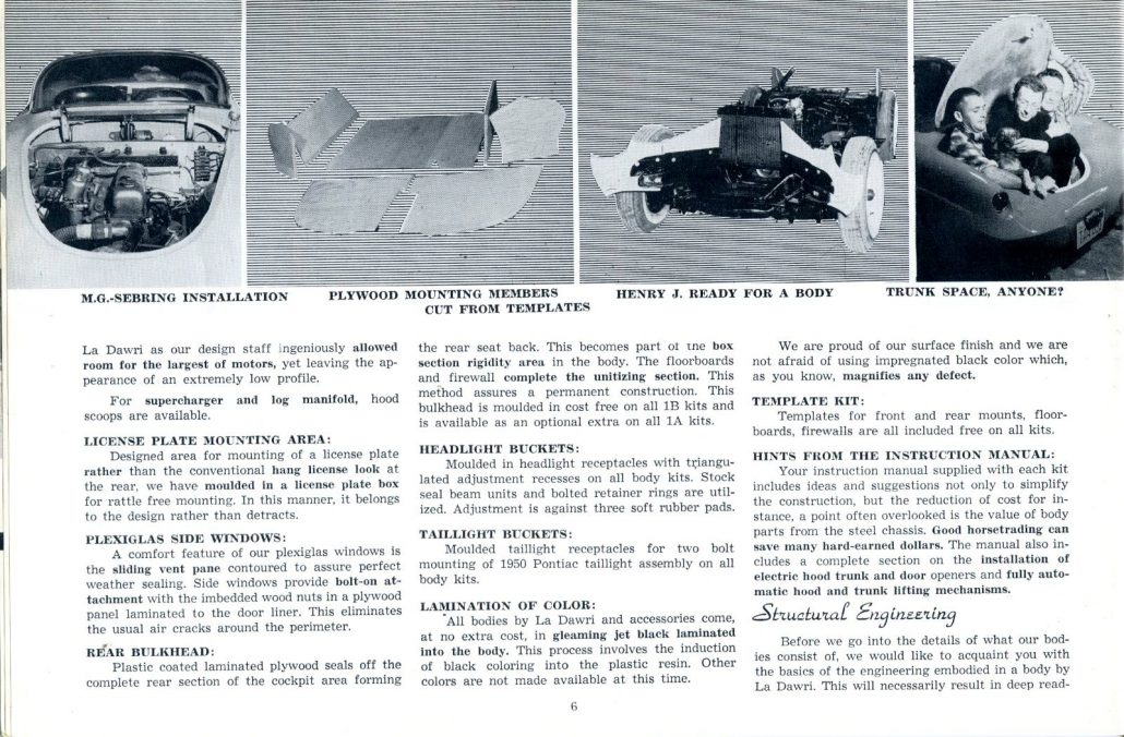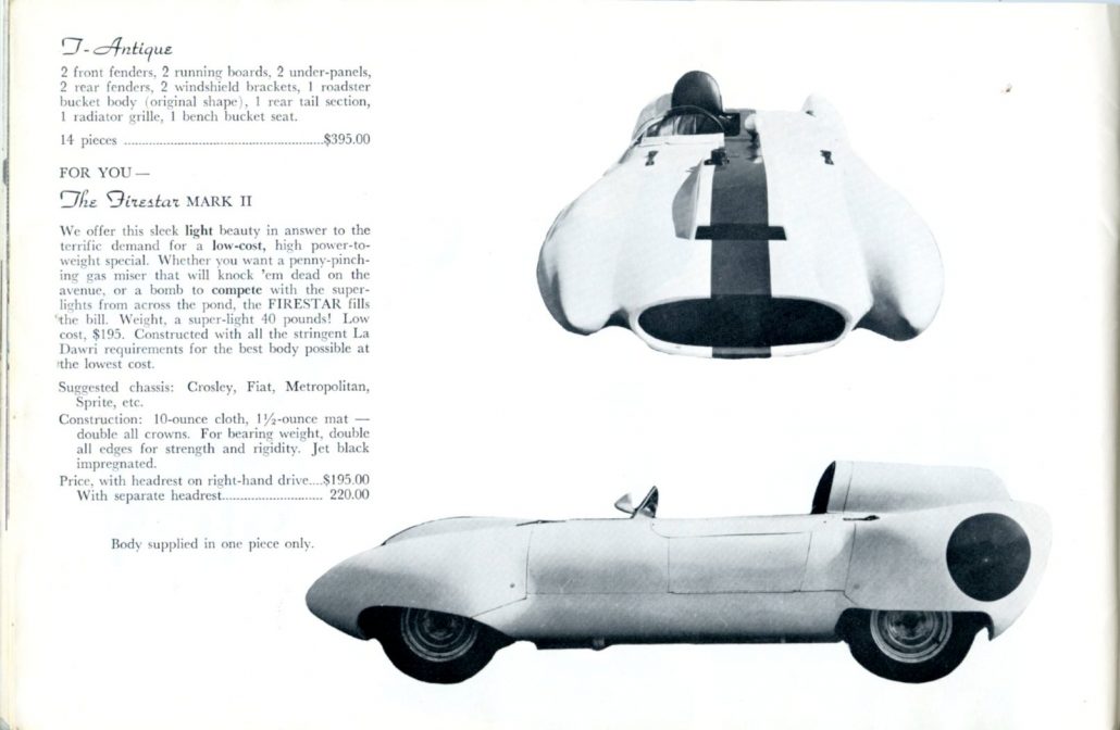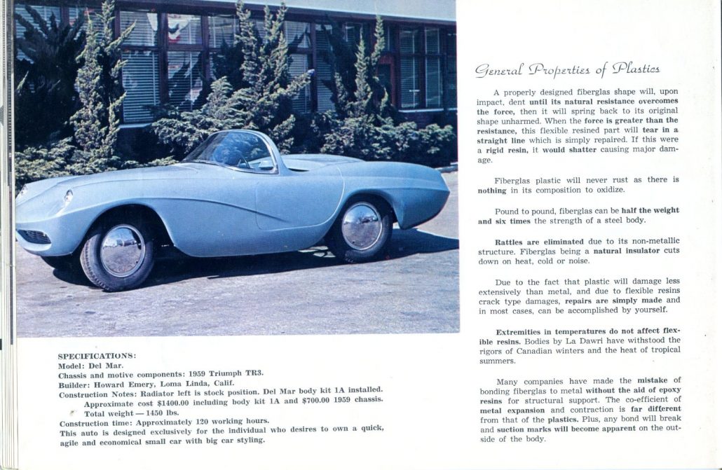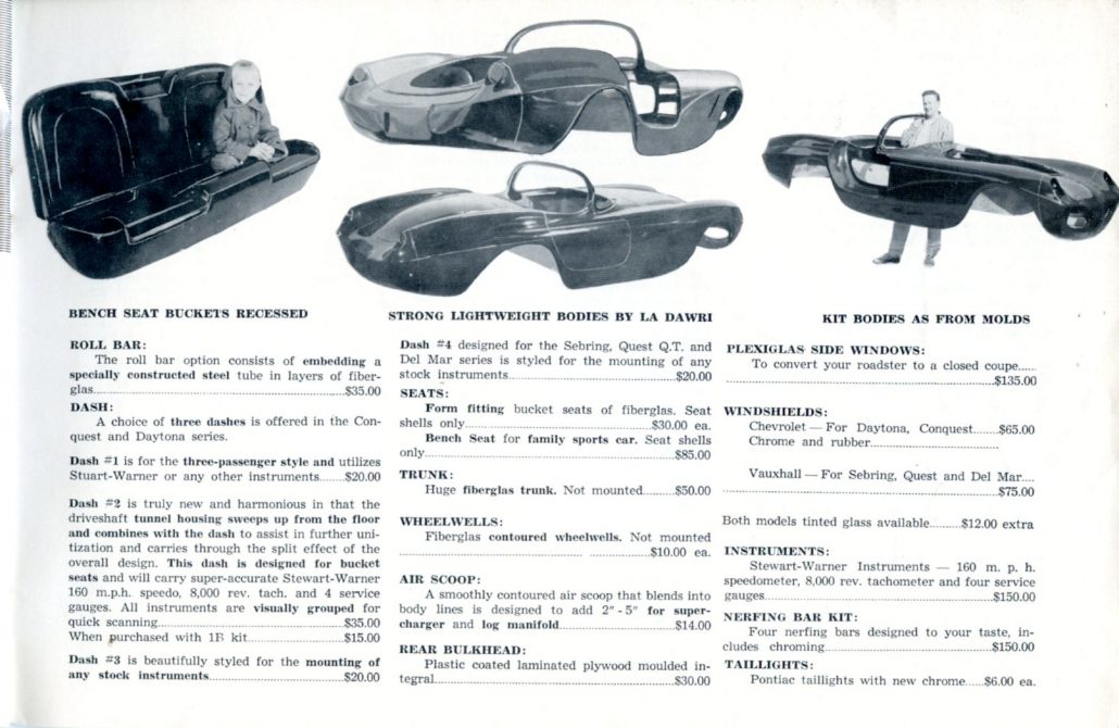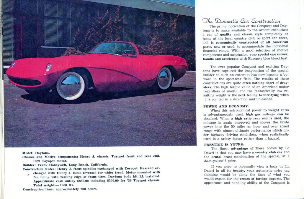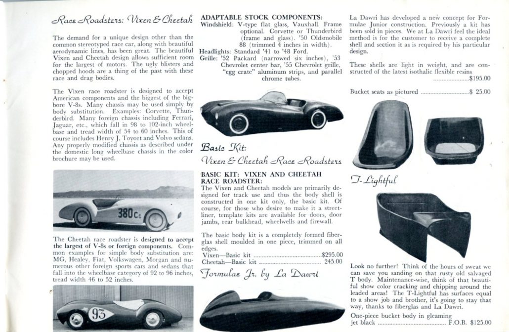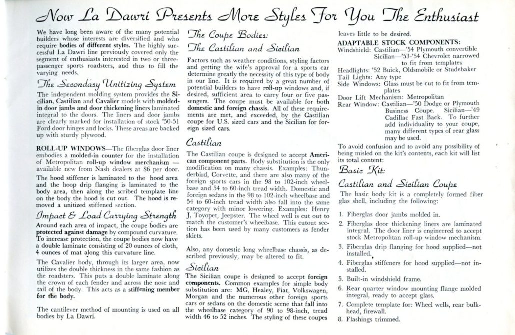 I have this catalog that I sent away for in time. Was going to build a Sicilian on a 54 Corvette chassis back then. As a young punk, I even had the chassis from a wreck. Kept after La Dawri to give me the address of a completed car so I could see what the body construction was like. Finally they did and I went to look at it… folded up shop, sold the chassis and that was that until the Blakely Bearcat, which I built back in 1980s. Royalite and a beauty of a kit. (I sent you pics and story of that some time ago).