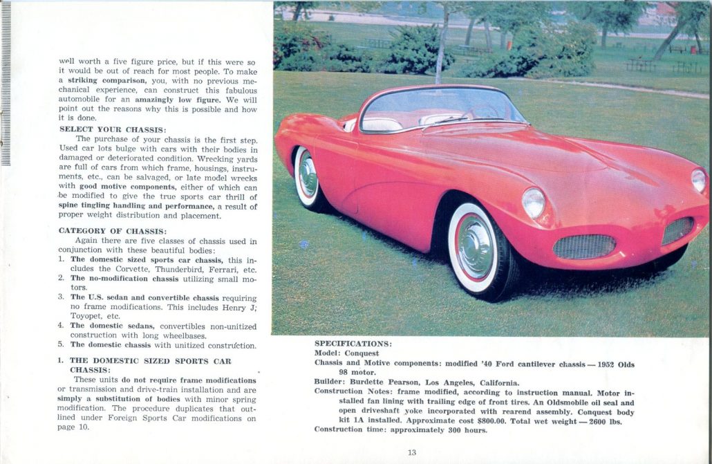Les Dawes was a very creative guy, in more ways than one: his first, and prettiest, car body is an eye-catcher by any standard, and he was an energetic and ambitious businessman, as his catalog clearly shows. He created several variations of his original design, so I’m a little surprised (and maybe flattered) that he didn’t modify any of the Victress bodies which he acquired. Some of the Conquest features might have been grafted onto the Victress coupes quite attractively, thus adding more “strings to his bow”. How’s that for a customizing idea, gang?