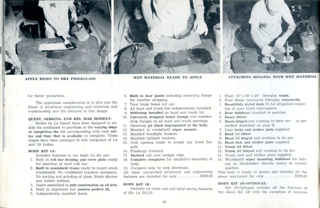 I just purchased a 1958? La Dawri Sebring (I believe). I still have to dig the car out from its storage spot, where it has been for some time. There is not a lot of information on this car from the owner. Her husband purchased it years ago in New York state. He had driven it down the driveway and parked it in the garage where it is today. Her husband passed away 3 years ago. the car is powered by a Crosley engine. There is another fiberglass body to go with this car as well in the purchase. She said it was also a La Dawri. from what I can see of this body it does not look like anything from this 1963 catalog. I would like to purchase a copy of the catalog if anyone has one they would part with.