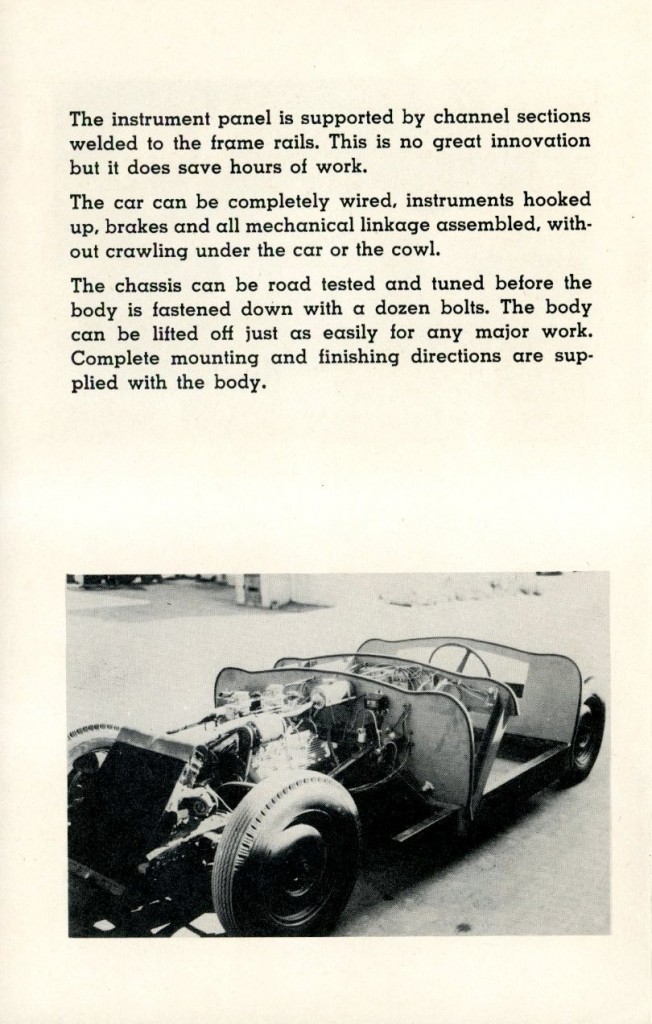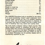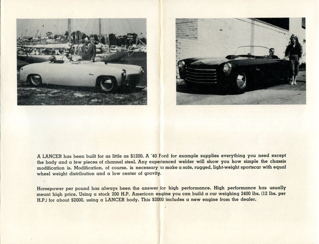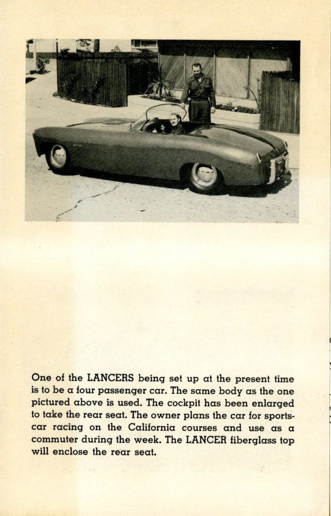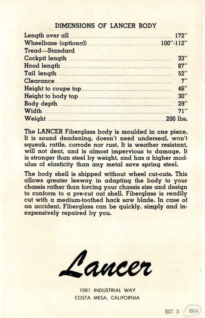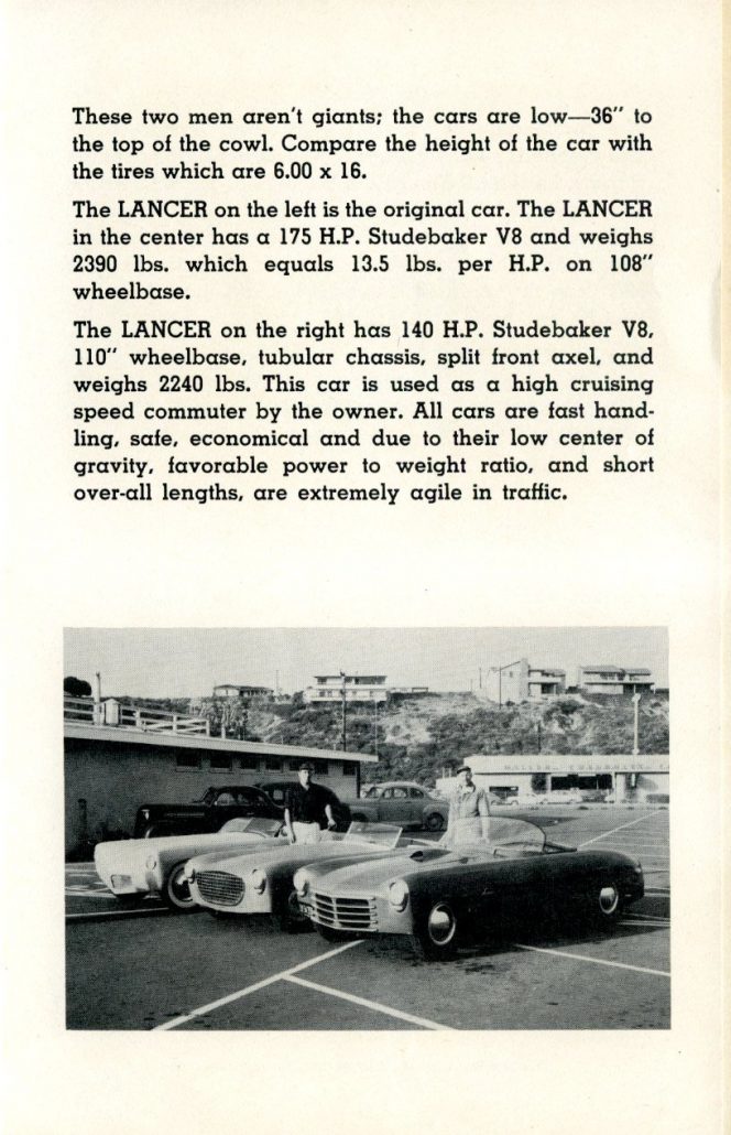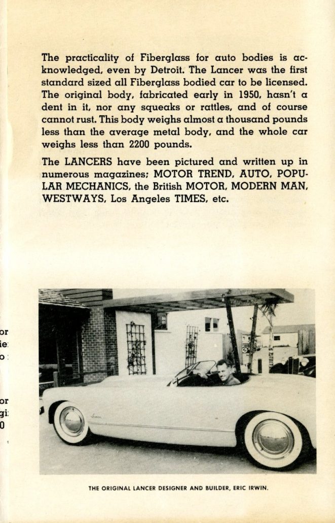 Although this brochure is dated from October 1955, it may have been something Eric had producing for 2-3 years. We know that his first Lancer style debuted in May, 1951, and that the second style was in development and was shown in photos in Motor Trend Magazine in December 1952. So the earliest this brochure could have been printed would have been sometime in ’53, but our estimate still is a 1954 start date. Research continues….