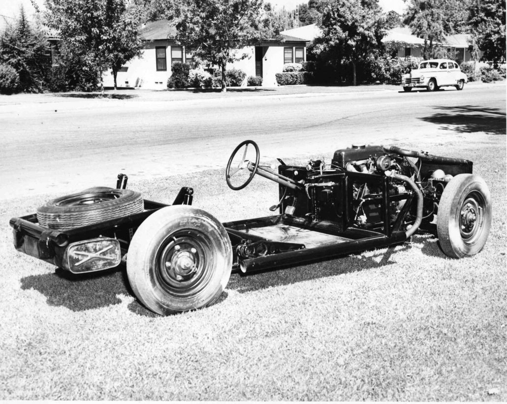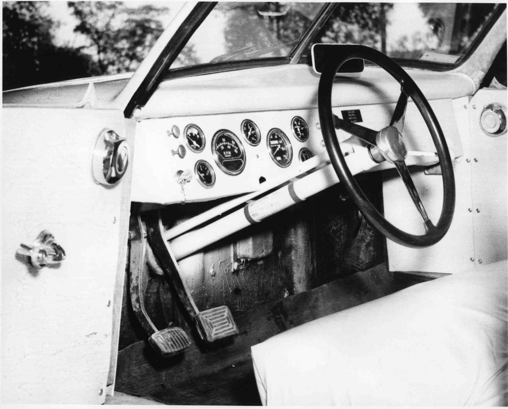 The brake and clutch pedal assemble is Ford, using two master cylinders. The slave cylinder to activate the clutch is aircraft surplus. The steering gear is Citroen, the column shift is Ford, the hub is M.G., and the wheel is for a midget racer. The wheels were cut down from the 400 m.m. size used on the Citroen to 16 inch. Four inch safety rims were furnished by Motor Wheel and Rim.