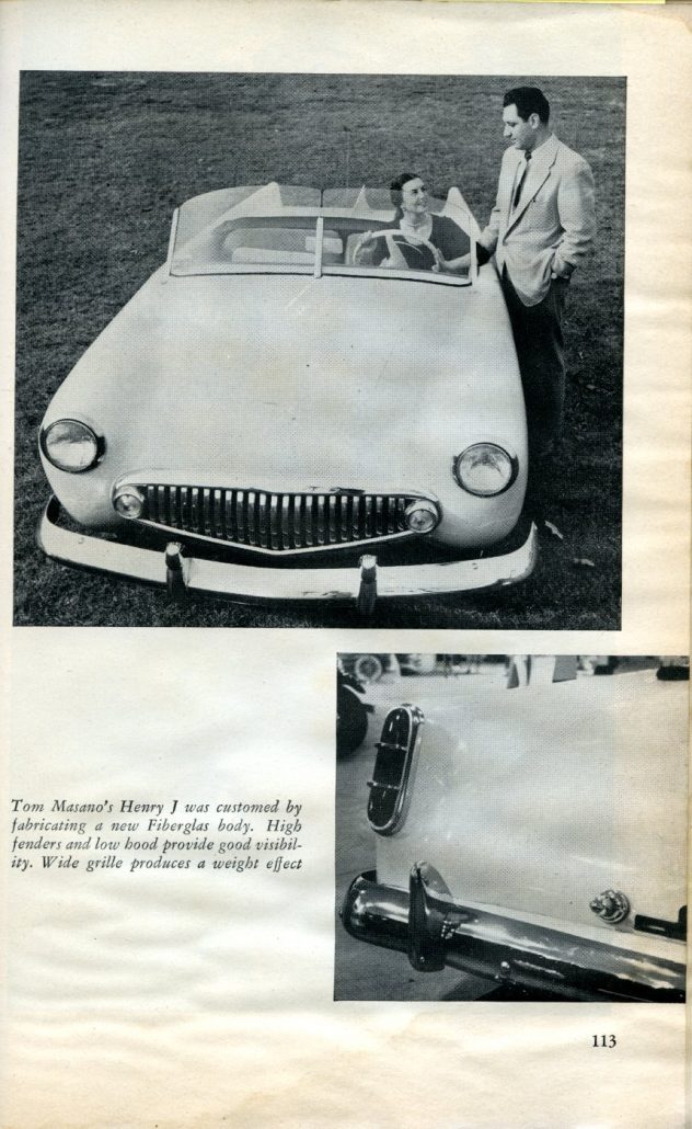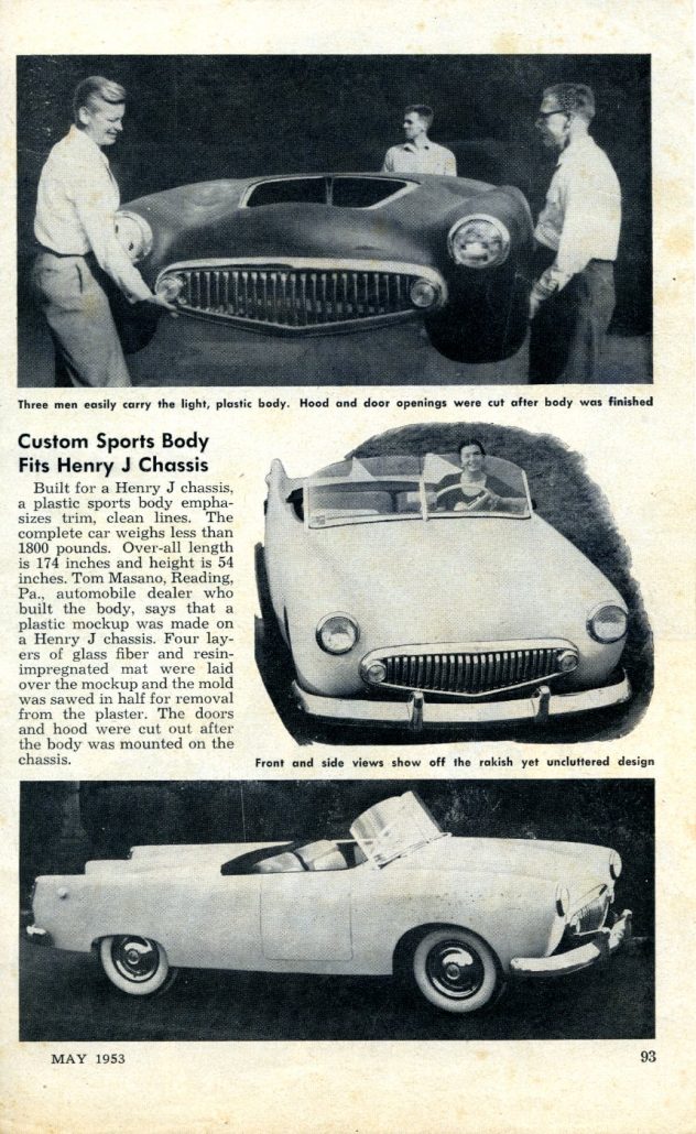 Fiberglass cars were designed, built, and celebrated across the USA back in the 1950’s. We tend to forget this because ground zero was Los Angeles, but inspiration on what they did in California percolated throughout the country – and the world. Tom Masano from Reading Pennsylvania was one of those inspired and in 1952/1953 put together a handsome sports car body for the Henry J chassis/drivetrain. Tailfin and all.