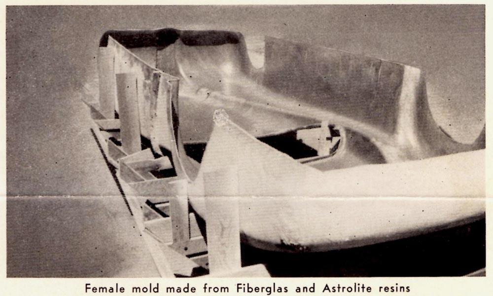 Designed to fit 123”-125” wheelbase cars, the overall length is 16’ and width 6’, weight approximately 220 pounds. Industrial Plastics Service formulate and market an extensive line of plastics resins – sold under their trade name “Astrolite.” Special formulations of those liquid plastics are used in conjunction with fiberglass in construction of sports car bodies, hardtops, boats, auto trailers, etc.