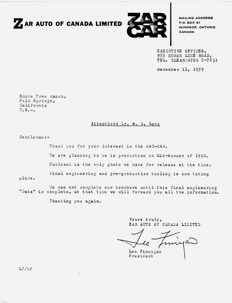 Bob Cunningham remembers that a press photo showing the front of the car also exists – but we’re still looking for it at this time. And, as the letter from “Leo Finnigan, President of Zar Auto of Canada, Limited” states, there looks like there may have been a later brochure available – although we can’t confirm it at this time. It might be lurking in your very collection – ready to share with the only known owner of a “Zar Car” – Brent Myers.