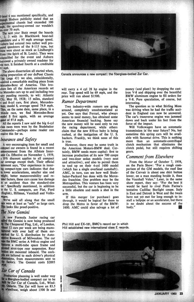 Production planning is well under way for a fiberglass-bodied compact car to be built by Zar Car of Canada, Ld., Windsor, Ontario. The Zar will have an 83.5 inch wheelbase, weigh about 1500 lbs, and will carry a 4 cylinder 28 horsepower engine in the rear. Top speed will be 69 mph, and the price will run about $1500.
