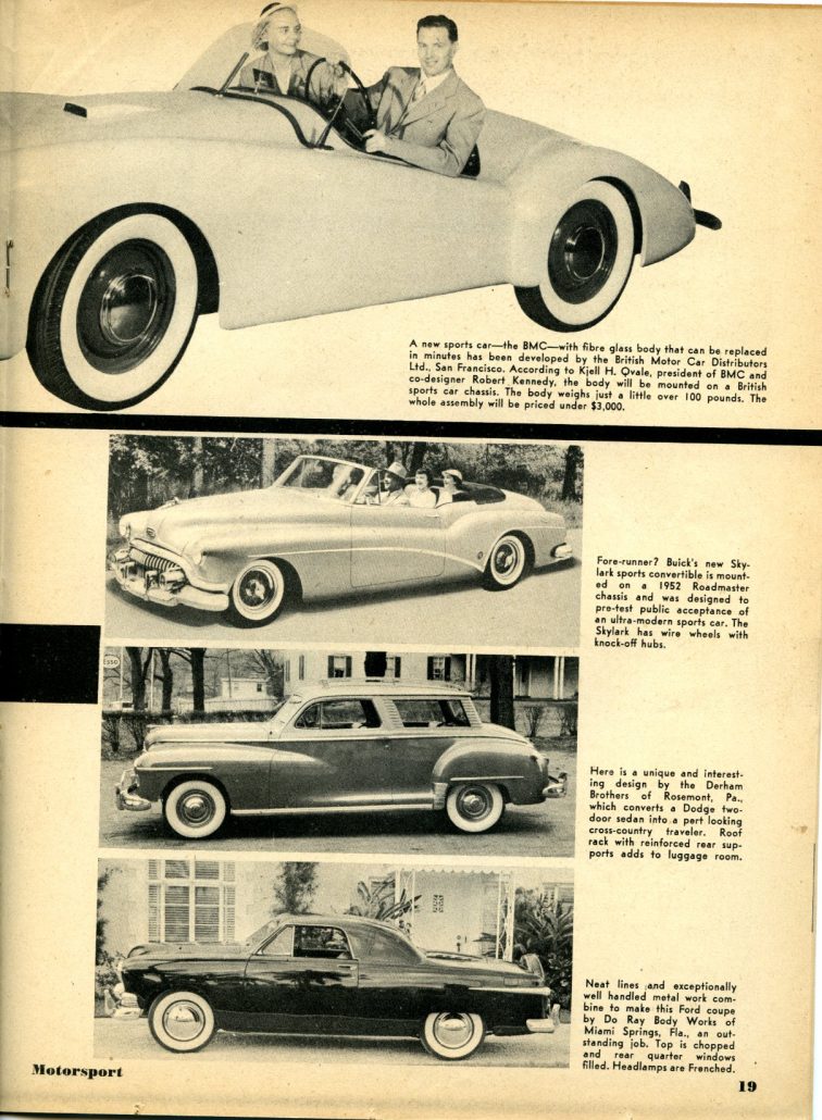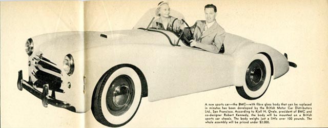 A new sports car – the BMC – with fiberglass body that can be replaced in minutes has been developed by the British Motor Car Distributors Ltd., San Francisco. According to Kjell H. Qvale, president of BMC and co-designer Robert Kennedy, the body will be mounted on a British sports car chassis. The body weights just a little over 100 pounds. The whole assembly will be priced under $3000.