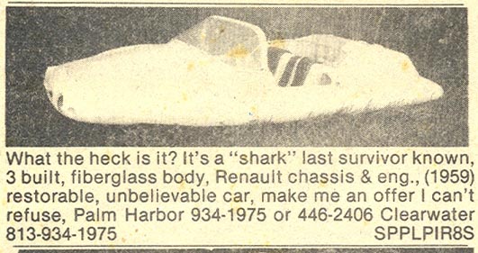“What the heck is it? It’s a “shark” last survivor known. Three built, fiberglass body, Renault chassis and engine (1959). Restorable, unbelievable car, make me an offer I can’t refuse. Palm Harbor / Clearwater Florida”.