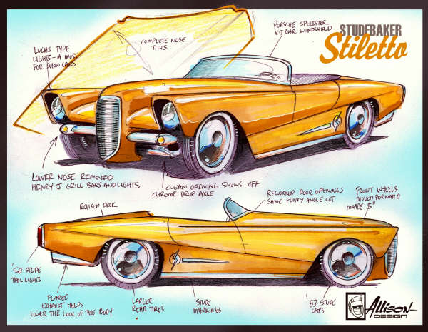 So…plan #1. Let’s fix the car (in theory) with photoshop and see what we get. To do this, I brought in my good friend Jeff Allison, who is a designer and artist up in the NorthWest. Jeff loved the idea and proposed we do a few things to the car. First…he moved the front axle forward. Next…he added a styling line on the side that would make the shape of the door more appealing. Finally…he completed the Studebaker theme with Stude hubcaps and a nice hardtop too. Interesting proposal here with other design elements included, and much nicer looking car. You can see these in the Photoshop images showing the original car at the top of each image and the photoshopped car at the bottom.