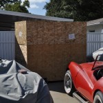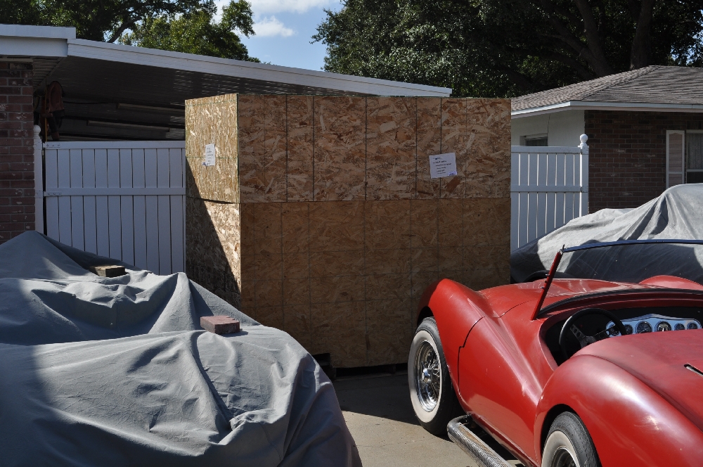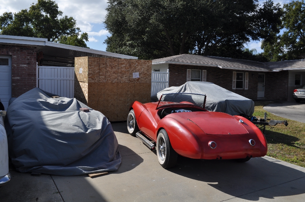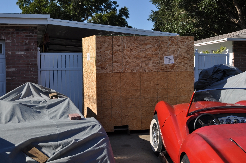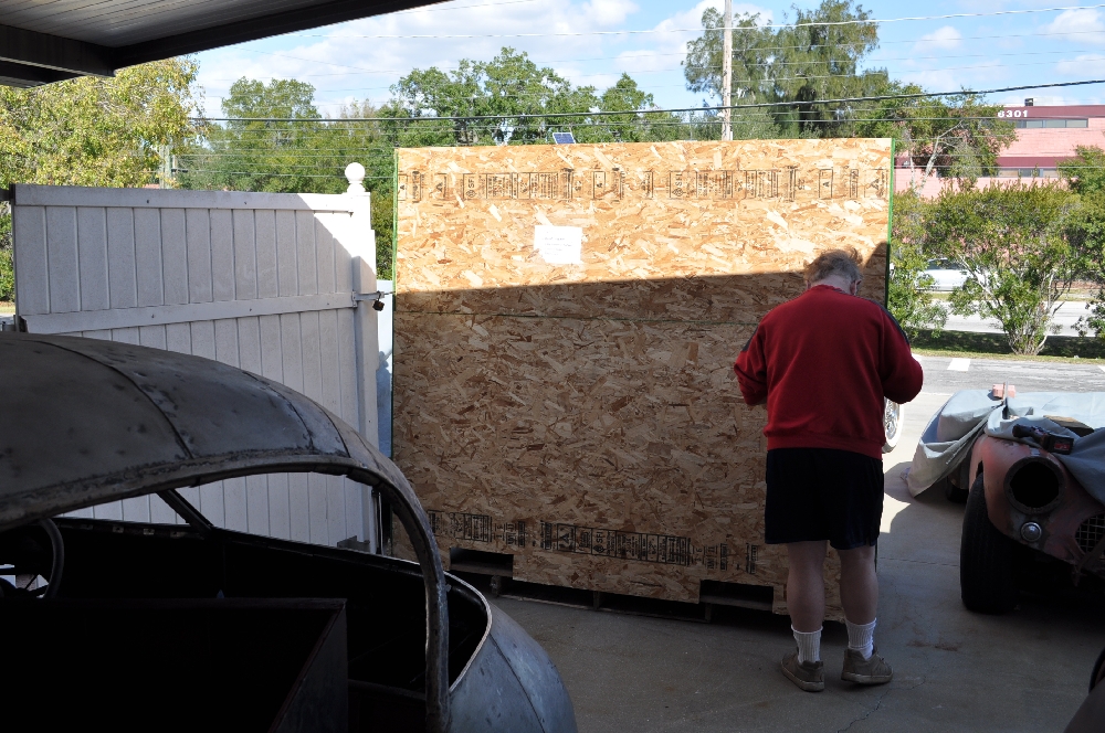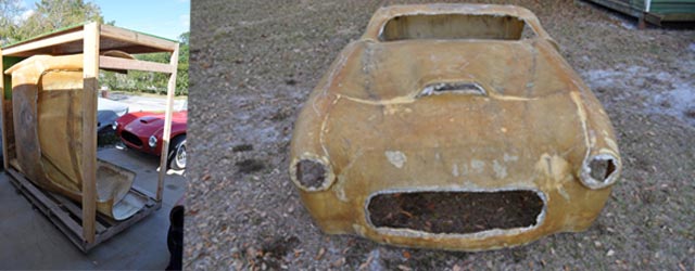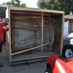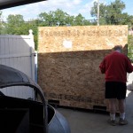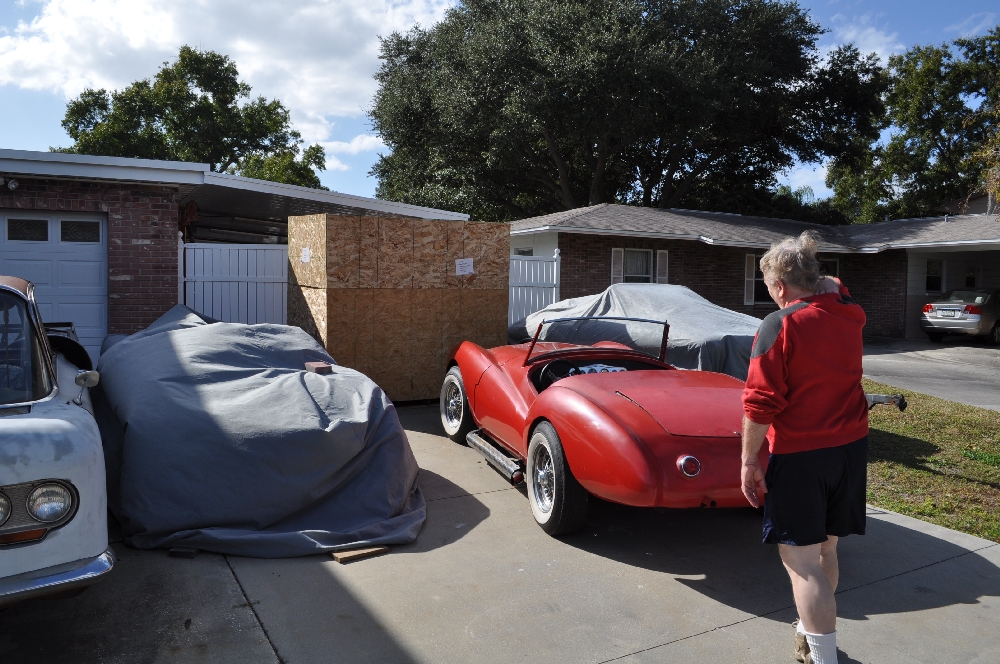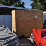 Several days later when the neighbors showed up with hot tar and feathers, we decided to uncrate the body (I thought hot tar, pitchforks, and feathers were a thing of the past…)  Here I pressed my Uncle Phil – “Phoon” as he is known in our family –  into action.  First we uncrate the package, and then check out the vintage ‘glass body for the very first time in its new home in Florida.