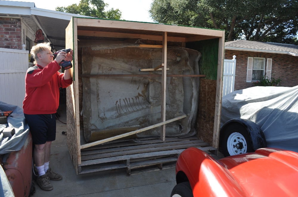 In the ‘50s, the crates were not solid like this – more of a series of boards to protect the body – and most of the body could still be seen from outside the crate looking in.  Back then, I understand many of the “crates” arrived via railcar.  I’ll have to ask if the folks who built their cars in the ’50s if they had to pick up the crates or if they were delivered.