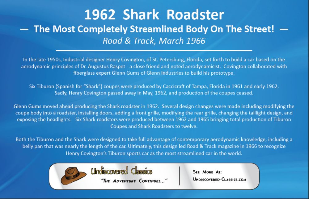 The cards are 5.5 inches by 8.5 inches with a photo of either the front or back of the Shark on the front of the card, and information about the car on the back of each card. We’ve been taking this approach for the last few years and have found that it helps with the attendees who are interested in learning more about any of the cars that each of us own that have rarely – if ever – been shown at a public event.