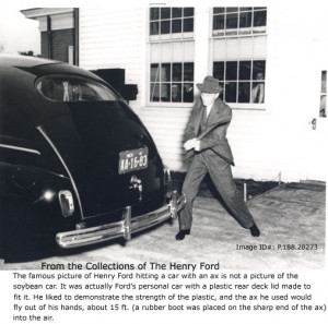 In doing our research, Rick D’Louhy and I have been keenly aware of Ford’s innovation and promotion of the first plastic automobile. I’ve been organizing my literature and recently came across an article in the March 1941 issue of Popular Science that discussed Ford’s progress and intentions of building such a car. I always thought that the picture showing Henry Ford swinging an axe and hitting the trunk of a car was the plastic car. I was wrong (and apparently many other people are too!).