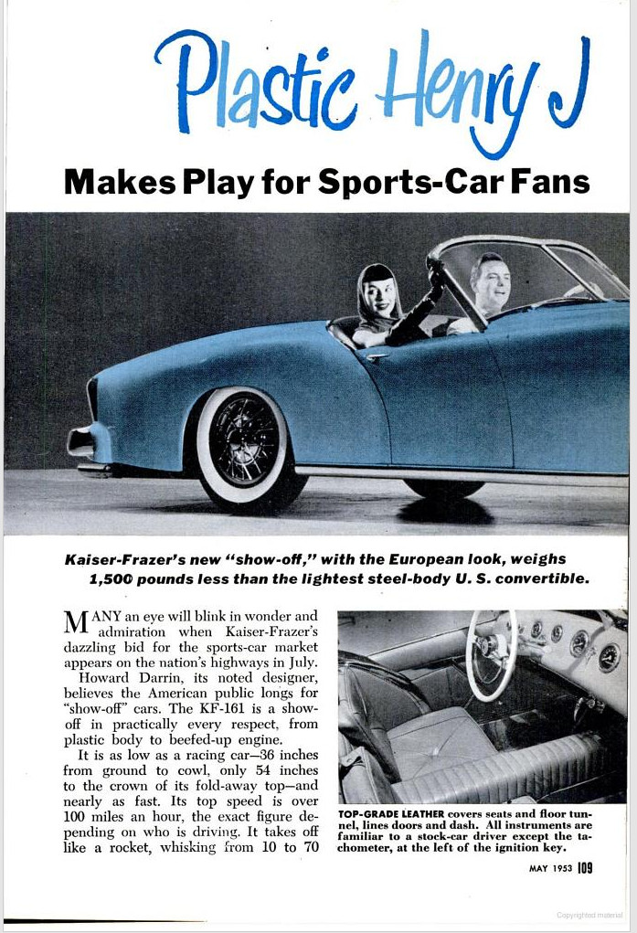 Many an eye will blink in wonder and admiration when Kaiser-Frazer’s dazzling bid for the sports-car market appears on the nation’s highways in July. Howard Darrin, its noted designer, believes the American public longs for “show-off” cars. The KF-161 is a show-off in practically every respect, from plastic body to beefed-up engine.