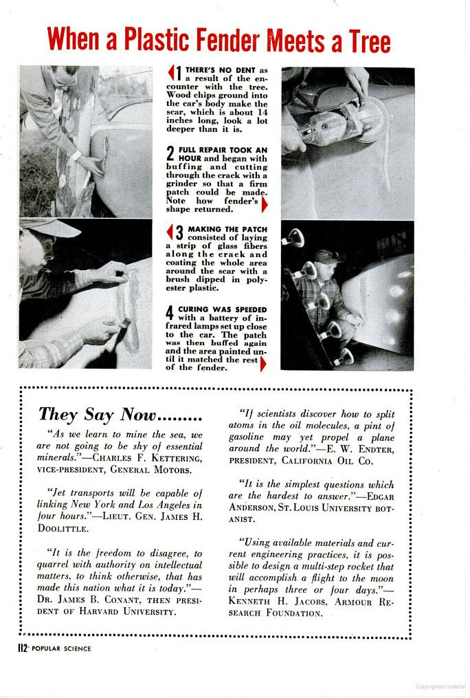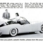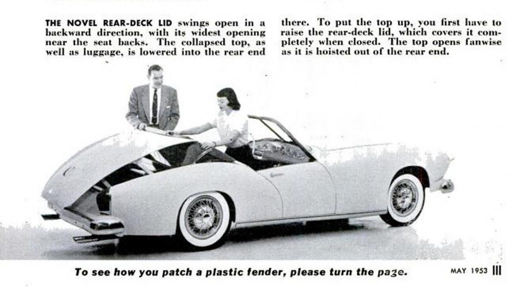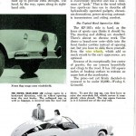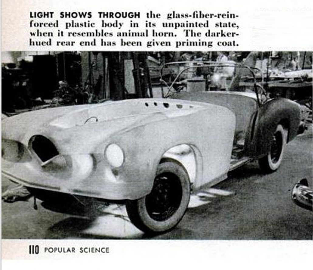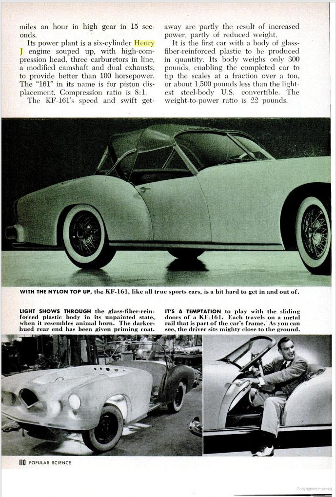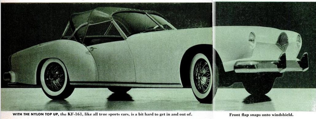 The KF-161’s speed and swift get-away are partly the result of increased power, partly of reduced weight. It is the first car with a body of glass fiber reinforced plastic to be produced in quantity Its body weighs only 300 pounds, enabling the completed car to tip the scales at a fraction over a ton, or about 1500 pounds less than the lightest steel-body U.S. convertible. The weight-to-power ratio is 22 pounds.