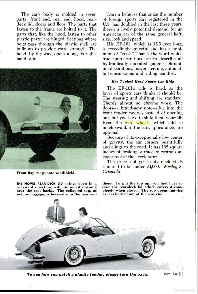 Darrin believes that since the number of foreign sports cars registered in the U.S. has doubled in the last three years, there’s a lively potential demand for an American car of the same general heft, size, look, and speed. The KF-161, which is 15.3 feet long, is exceedingly graceful and has a minimum of “gook.”