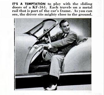 The KF-161’s ride is hard, as the lover of sports cars thinks it should be. The steering and shifting are standard. There’s almost no chrome work. The doors – a brand-new note – slide into the front fender cavities instead of opening out, but you have to slide them yourself.