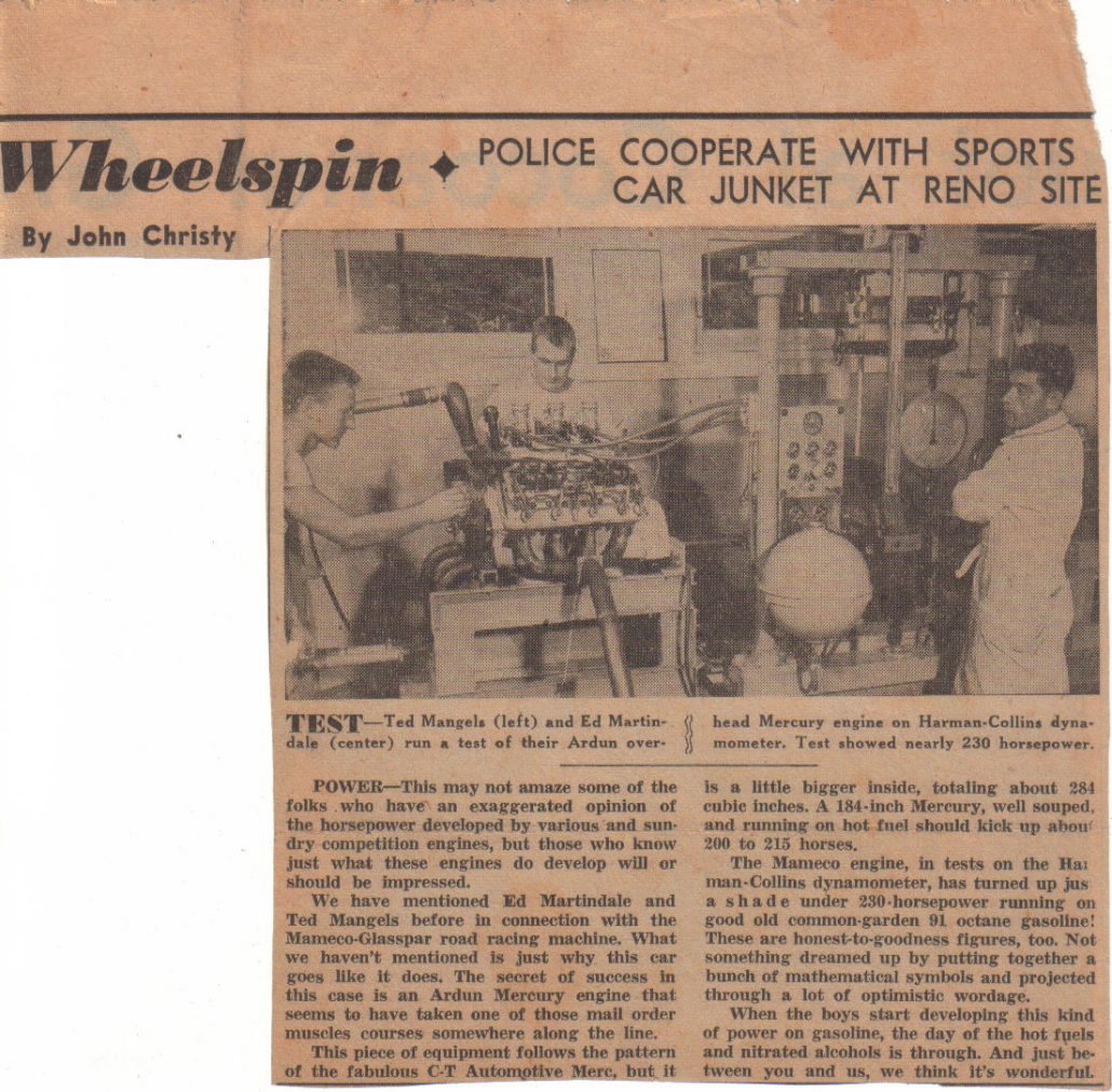 We have mentioned Ed Martindale and Ted Mangels before in connection with the Mameco-Glasspar road racing machine. What we haven’t mentioned is just why this car goes like it does. The secret of success in this case is an Ardun Mercury engine that seems to have taken one of those mail order muscles courses somewhere along the line.