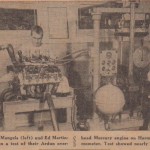 Caption: “TEST – Ted Mangels (Left) And Ed Martindale (Center) Run A Test Of Their Ardun Overhead Mercury Engine On Harmon-Collins Dynamometer. Test Showed Nearly 230 Horsepower.