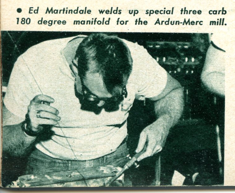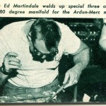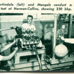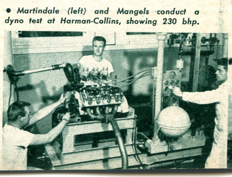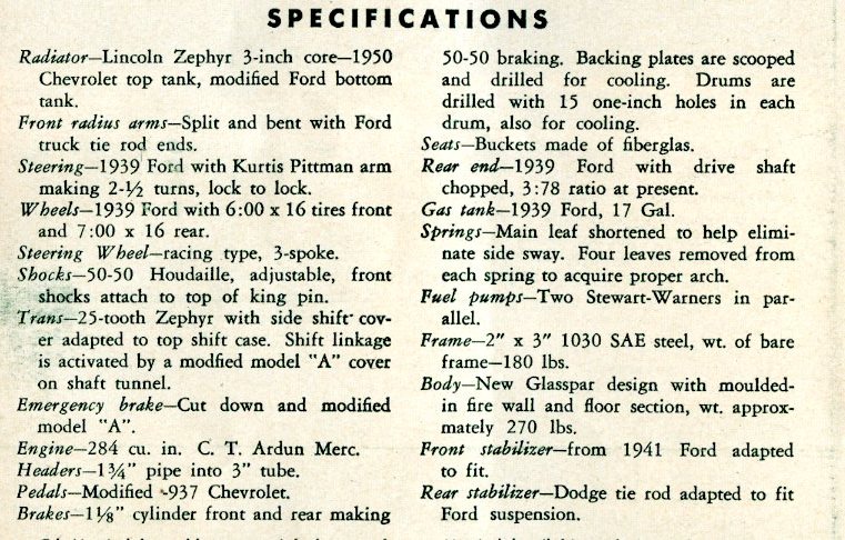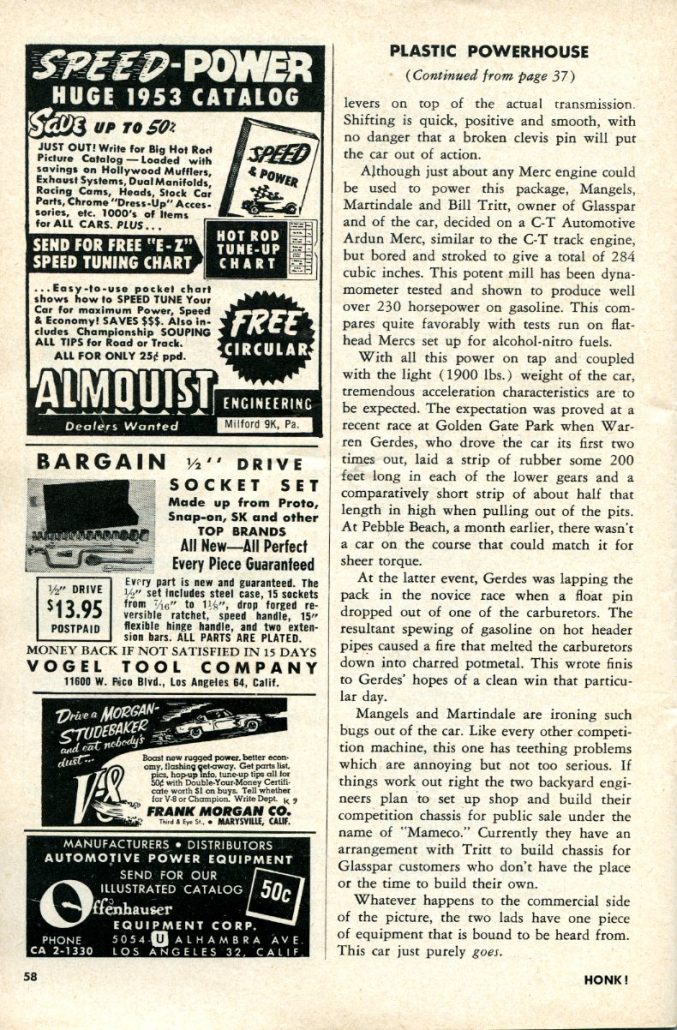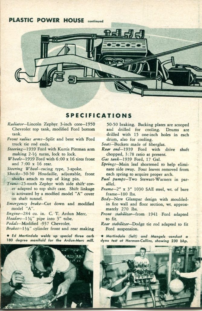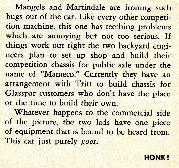 “The backyard equipment is moving in on the road racing scene with a loud, fast roar. ….Another standout was the Mameco Glasspar job powered by the potent C-T Automotive Ardun Mercury track engine. The car was a joint effort by Bill Tritt of Gasspar, Ed Martindale and Ted Mangels of Mameco, who built the chassis, and Clem TeBow and Don Clark of C-T, who stuffed the engine into the rig. The running gear was built up from Ford parts, and anybody who says cross-spring suspensions don’t handle is hence-forth going to find an argument. Martindale admits that torsion bars and swing axles would have helped some, but our observation was that the car did a terrific job the way it was. A series of unfortunate accidents kept Warren Gerdes who drove the car, out of the winner’s circle, but while the car was running, it was phenomenal.