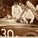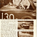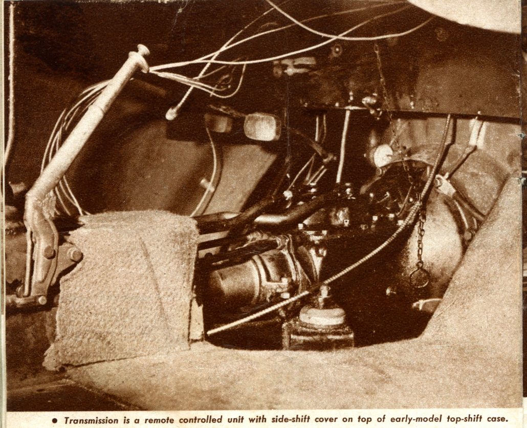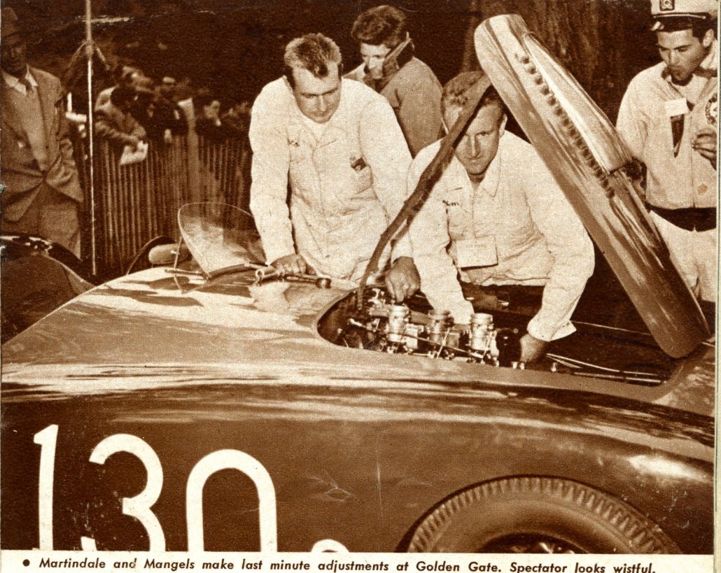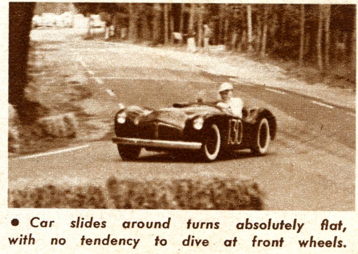 “With all this power on tap and coupled with the light (1900 lbs) weight of the car, tremendous acceleration characteristics are to be expected. The expectation was proved at a recent race at Golden Gate Park when Warren Gerdes, who drove the car in its first two times out, laid a strip of rubber some 200 feet long in each of the lower gears and a comparatively short strip of about half that length in high when pulling out of the pits. At Pebble Beach, a month earlier, there wasn’t a car on the course that could match it for sheer torque”