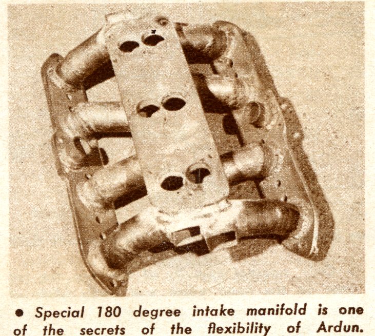 “In Sherman Oaks, California, there was CT Automotive (Clark and Tebow Automotive), and we built the motor in their shop. The engine had a ½ inch longer stroke and 3/8″ bigger bore, and came out to 304 cubic inches. We (MAMECO) created an intake manifold for 3 carbs out of steel. We did this because the Ardun manifold did not perform as well as we would have liked.”