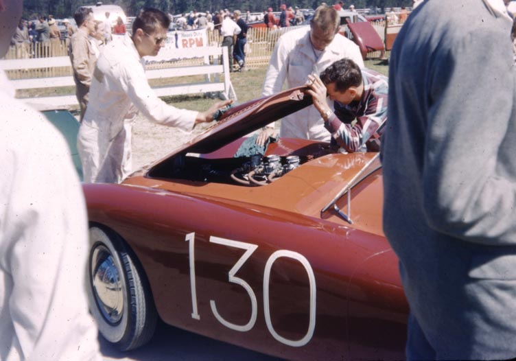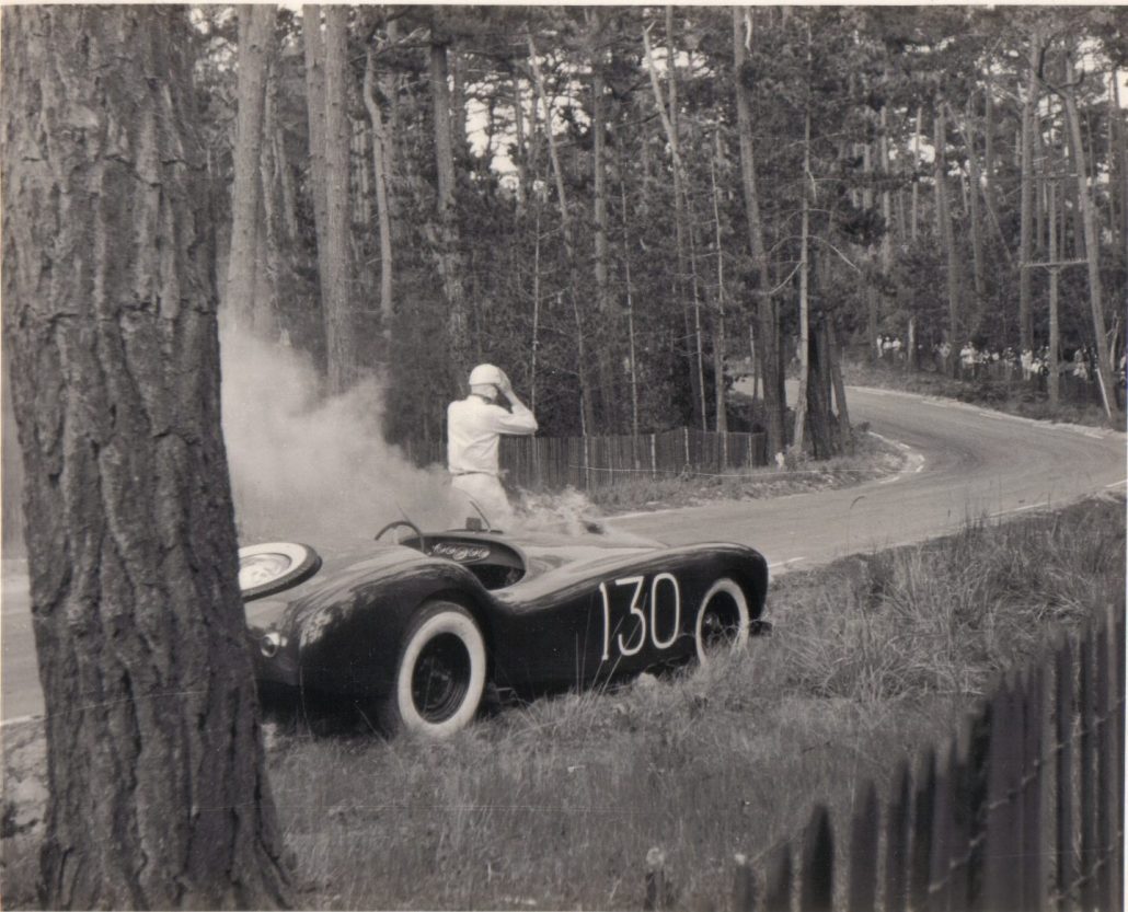 Enthusiast Mike Wittman snapped this picture of the Glasspar Racecar at Pebble Beach Back in 1953 when he was just 16 years old. He’s kept this picture all these years, and was kind enough to share this with us. Mike camped out overnight to see the race – right at Pebble Beach. The picture was taken on Saturday – before the carbs caught on fire.
