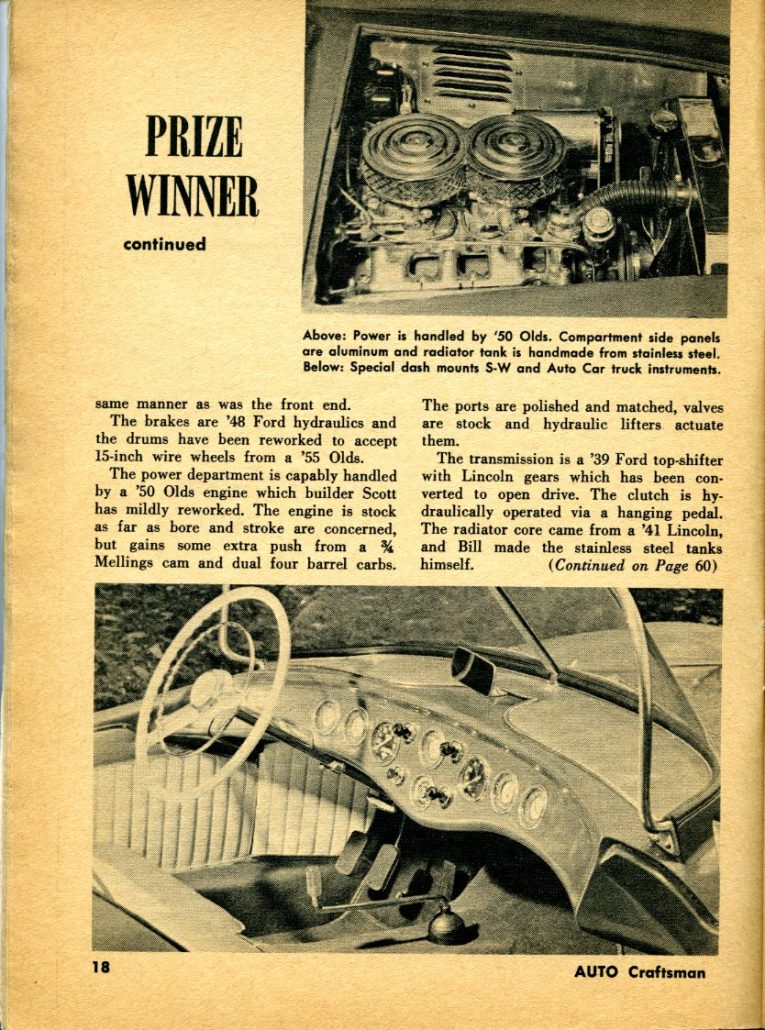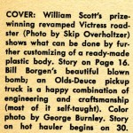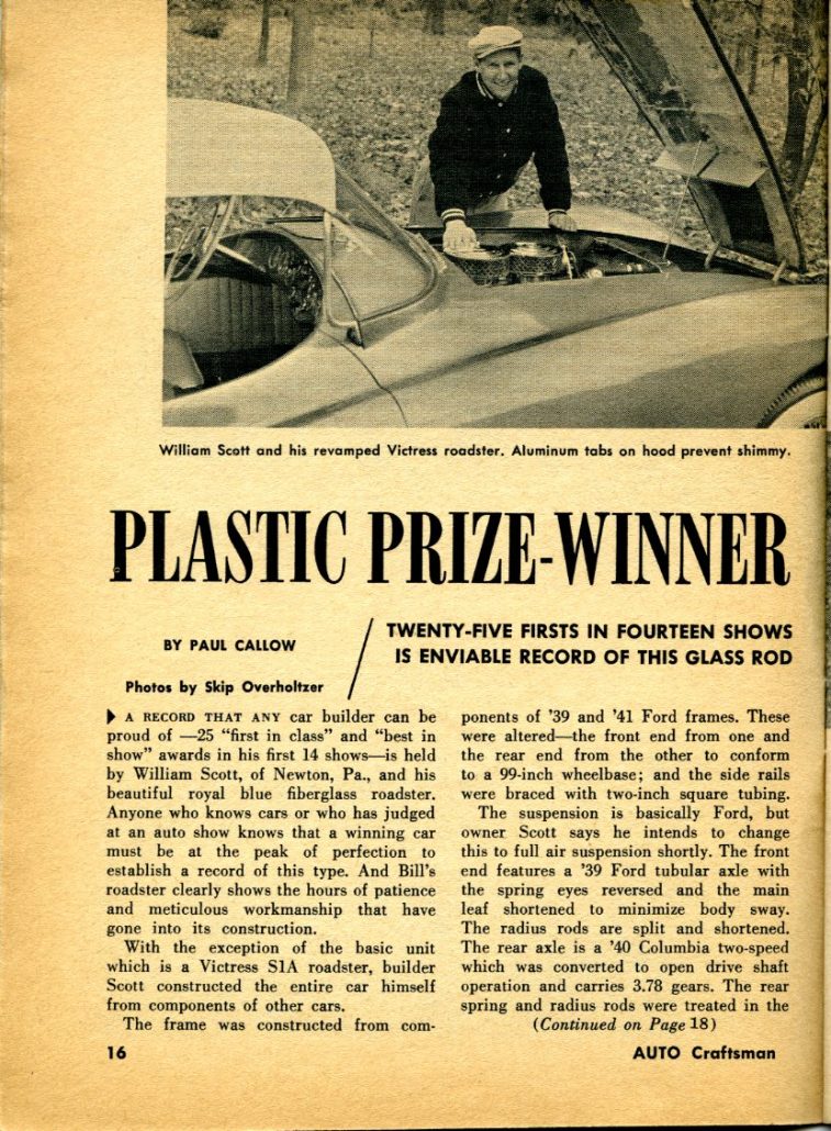 “A record that any car builder can be proud of – 25 “first in class” and “best in show” awards in his first 14 shows – is held by William Scott, of Newton, Pennsylvania, and his beautiful royal blue fiberglass roadster. Anyone who knows cars or who has judged at an auto show knows that a winning car must be at the peak of perfection to establish a record of this type. And Bill’s roadster clearly shows the hours of patience and meticulous workmanship that have gone into its construction.